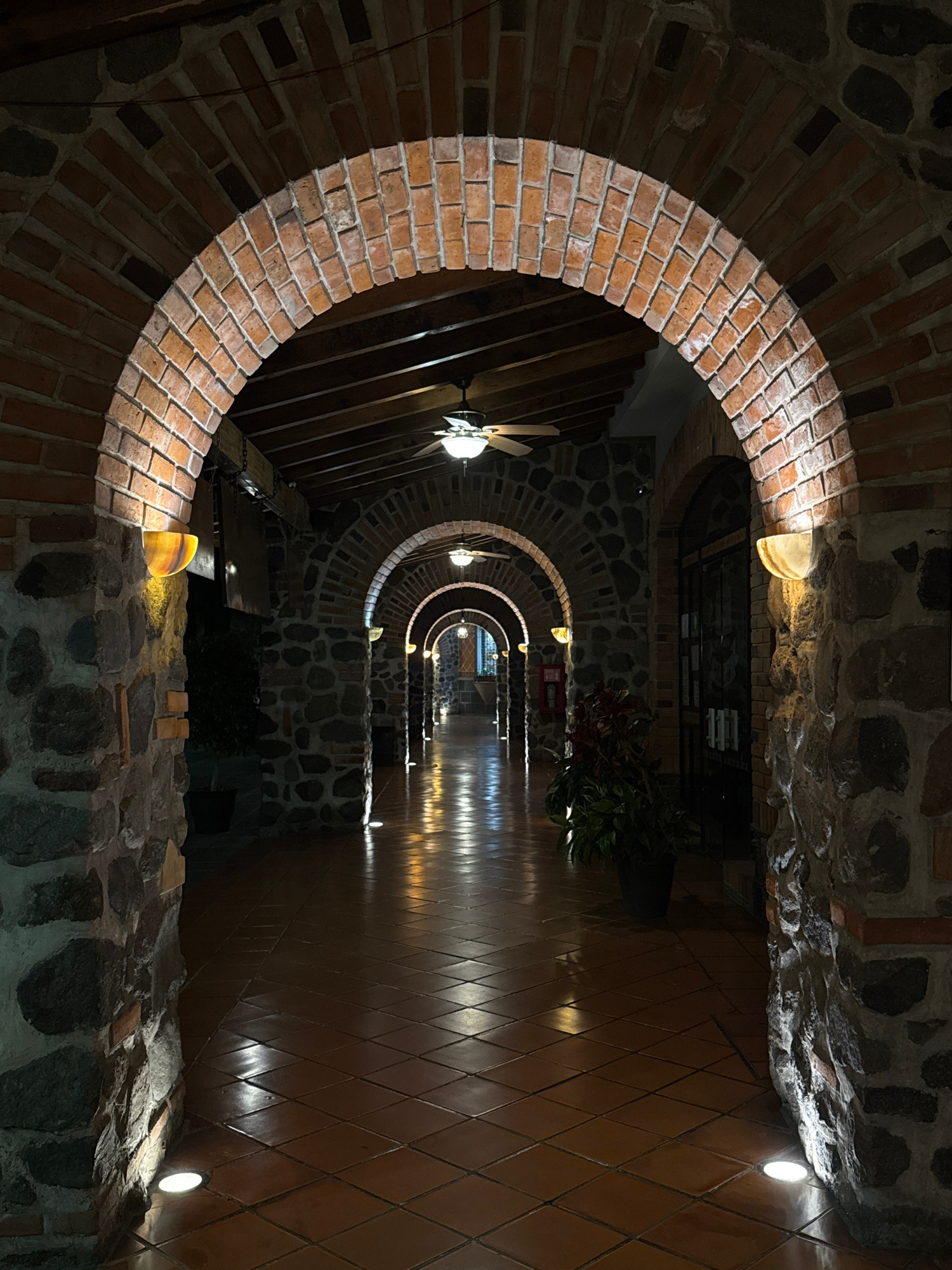 The image depicts a view through a series of brick and stone archways, creating a tunnel-like perspective. The foreground archway is made of red bricks. The walls between the arches are constructed fr…read more