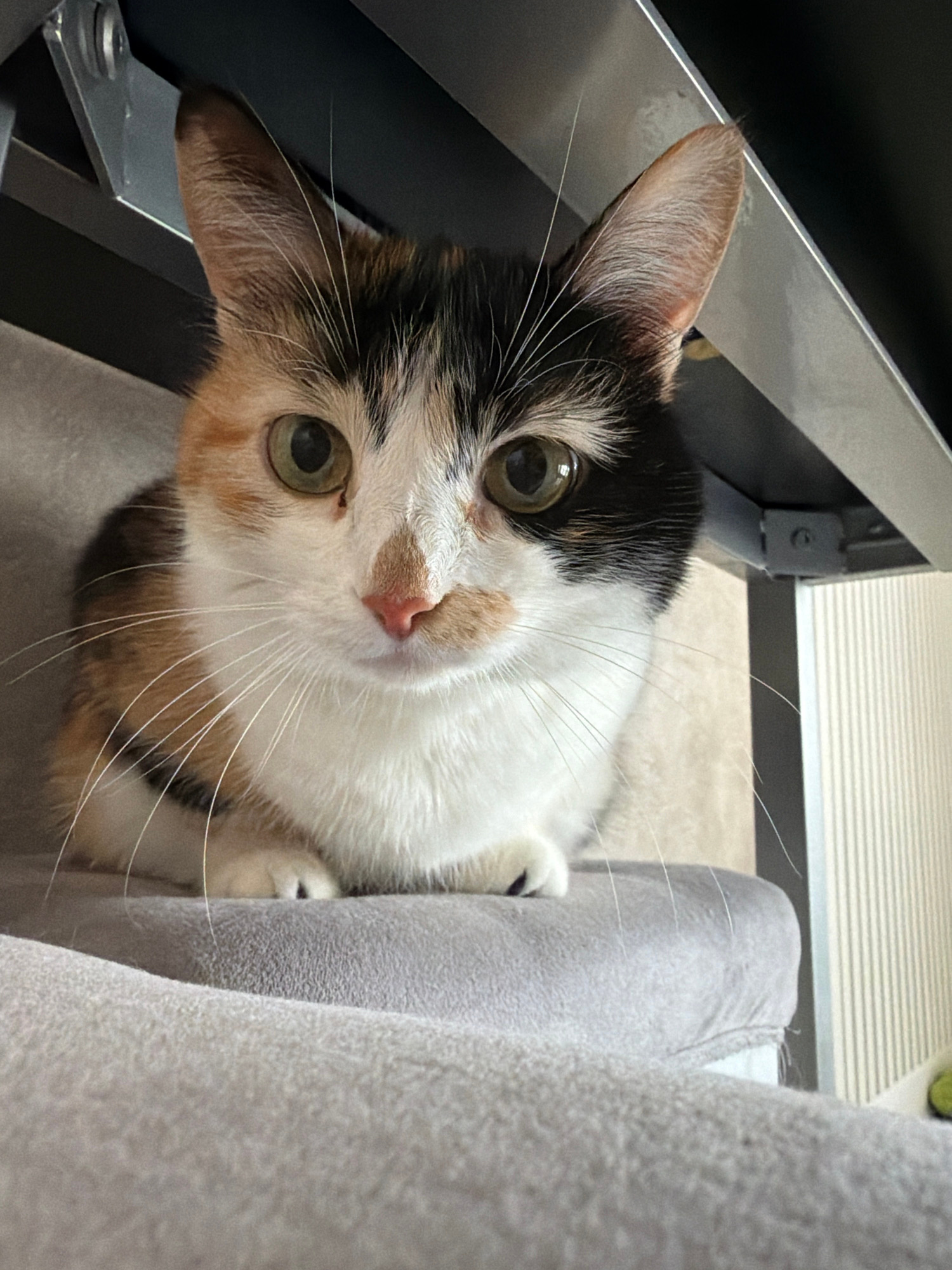A close-up, slightly rotated, high-angle photograph shows a calico cat looking up at the camera. The cat has white fur on its face and chest, with patches of black and orange on its head and ears. The…read more