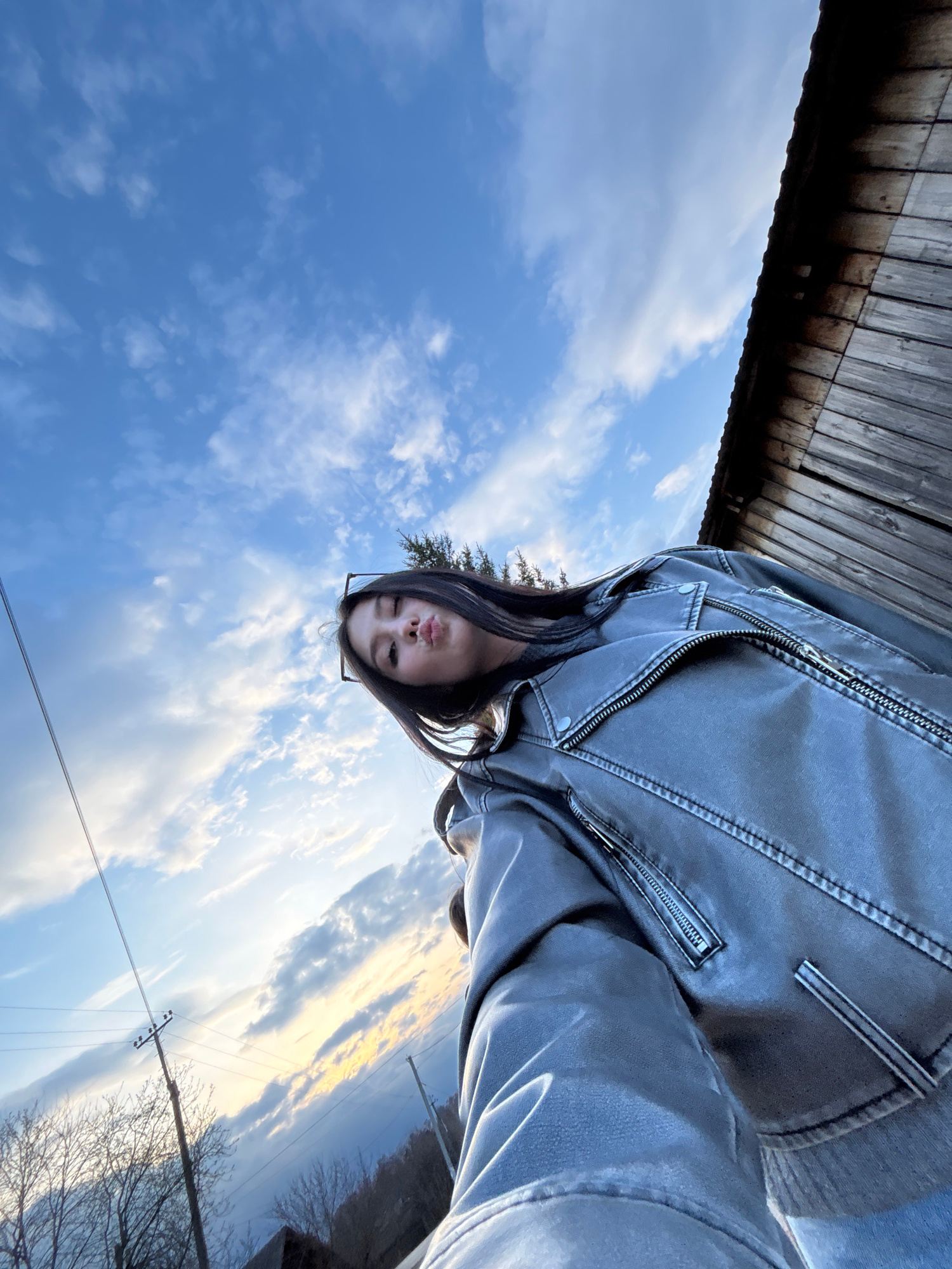 A woman with long dark hair, wearing a gray leather jacket and dark-rimmed glasses, is taking a selfie from a low angle. Above her is a bright blue sky with scattered white clouds. To the left, weathe…read more