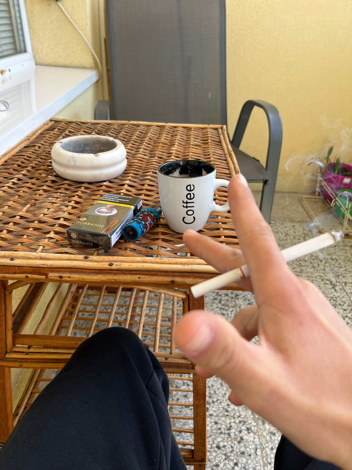 A close-up, high-angle shot captures a person's hand holding a lit cigarette, featuring several objects arranged on a woven rattan surface, likely part of outdoor furniture. The scene appears to be an…read more