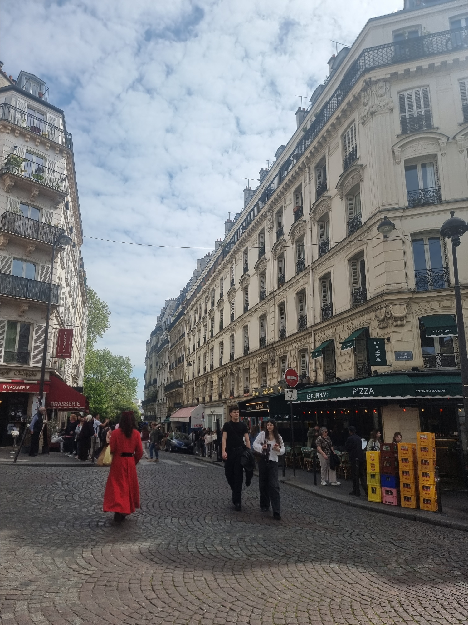 The image captures a vibrant street scene in Paris, France, featuring classic Haussmannian architecture and daily life under a cloudy sky. The perspective is tilted, showing tall, ornate buildings lin…read more
