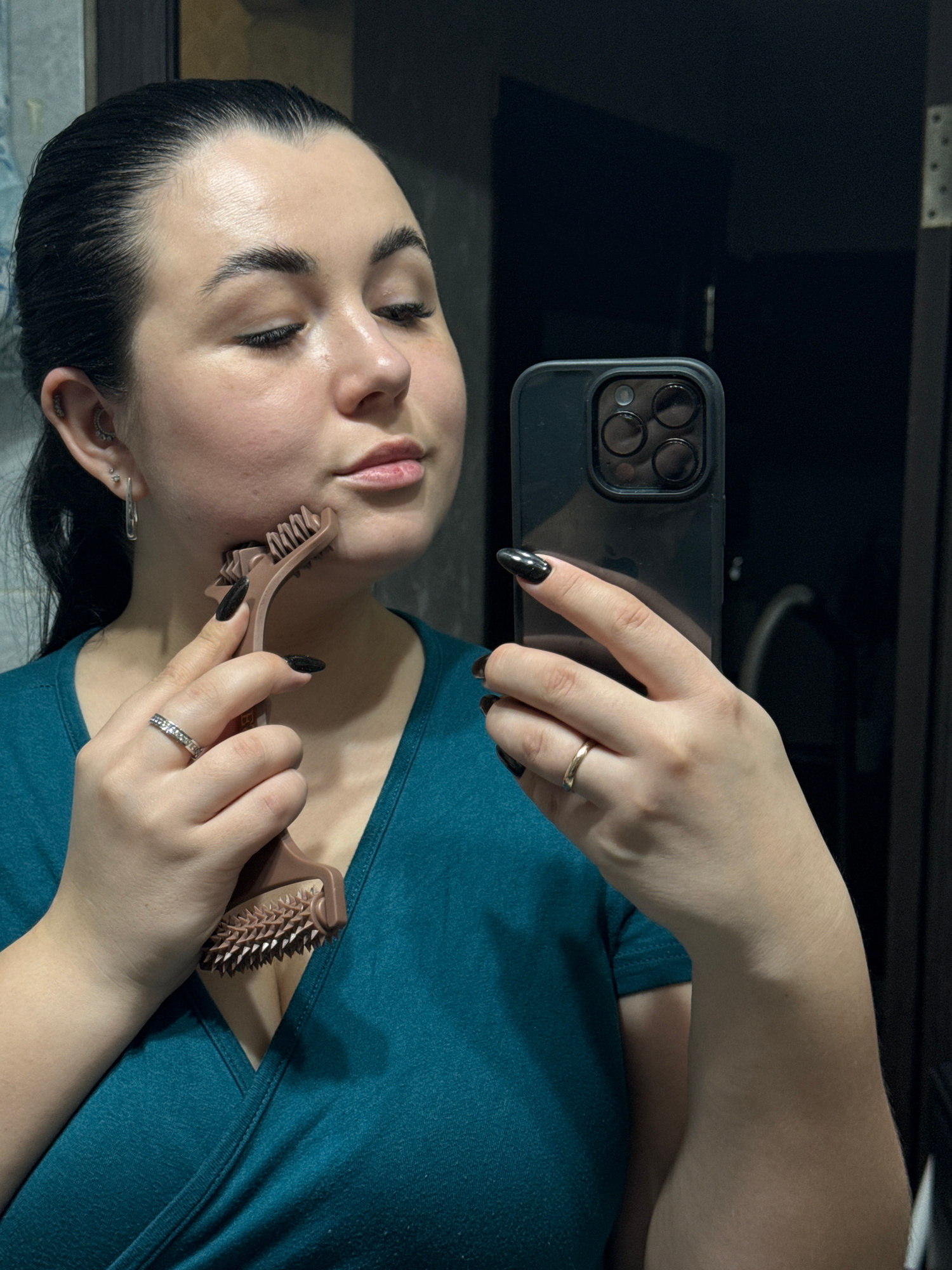A woman with black nails is using a facial massager. She is holding a cell phone up to take a picture of herself. The location is not discernible.