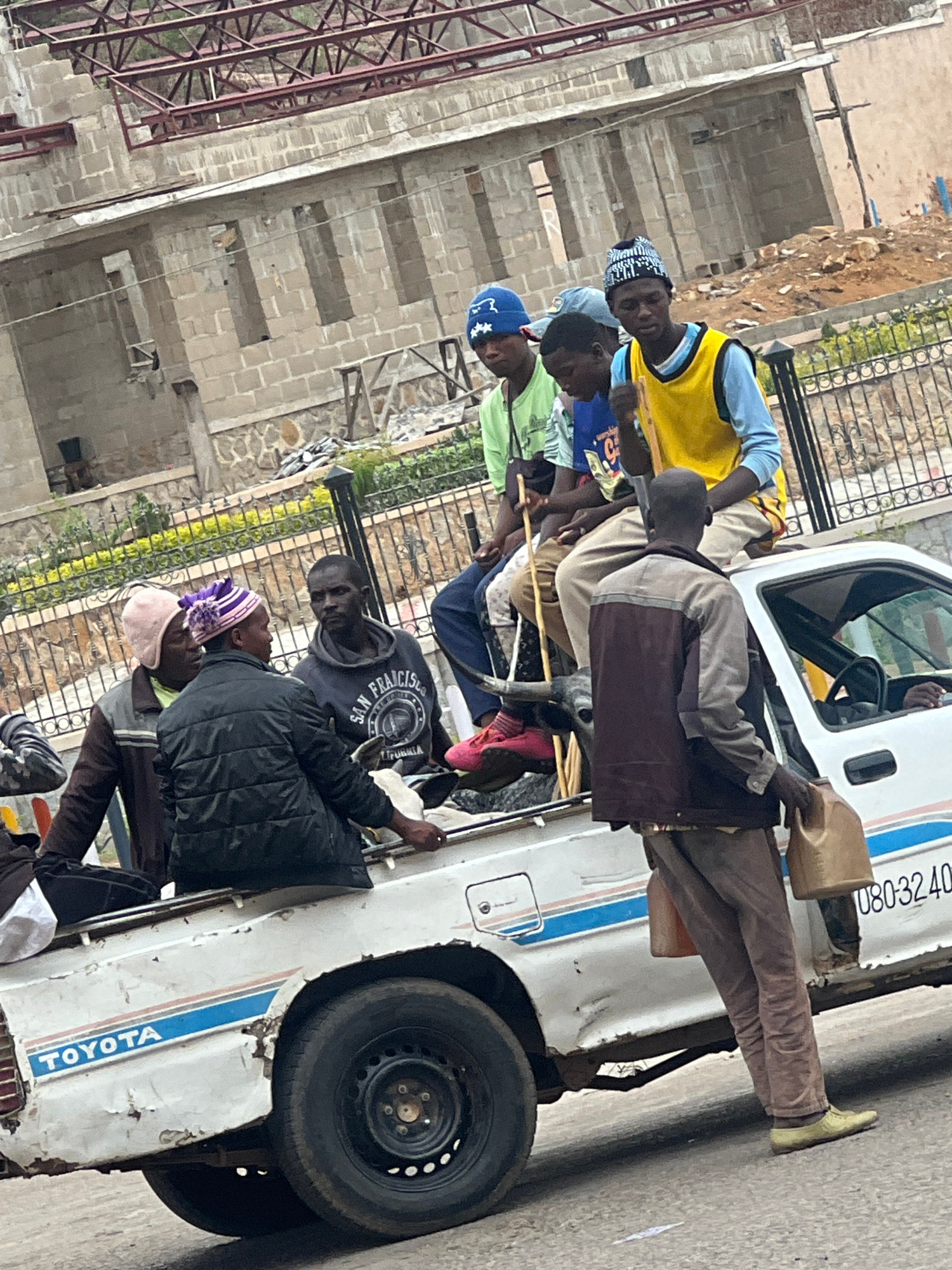 The image captures a daytime street scene in Jos, Nigeria, featuring a group of approximately 8-10 men and boys gathered around and within an old, white Toyota pick-up truck. Most individuals appear tβ¦read more