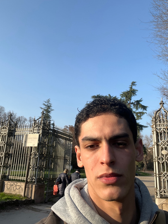 A male subject is depicted in a close-up, selfie-style photograph, positioned in the foreground before the entrance to the Giardini Pubblici (Indro Montanelli Public Gardens) in Milan, Italy. The subj…read more