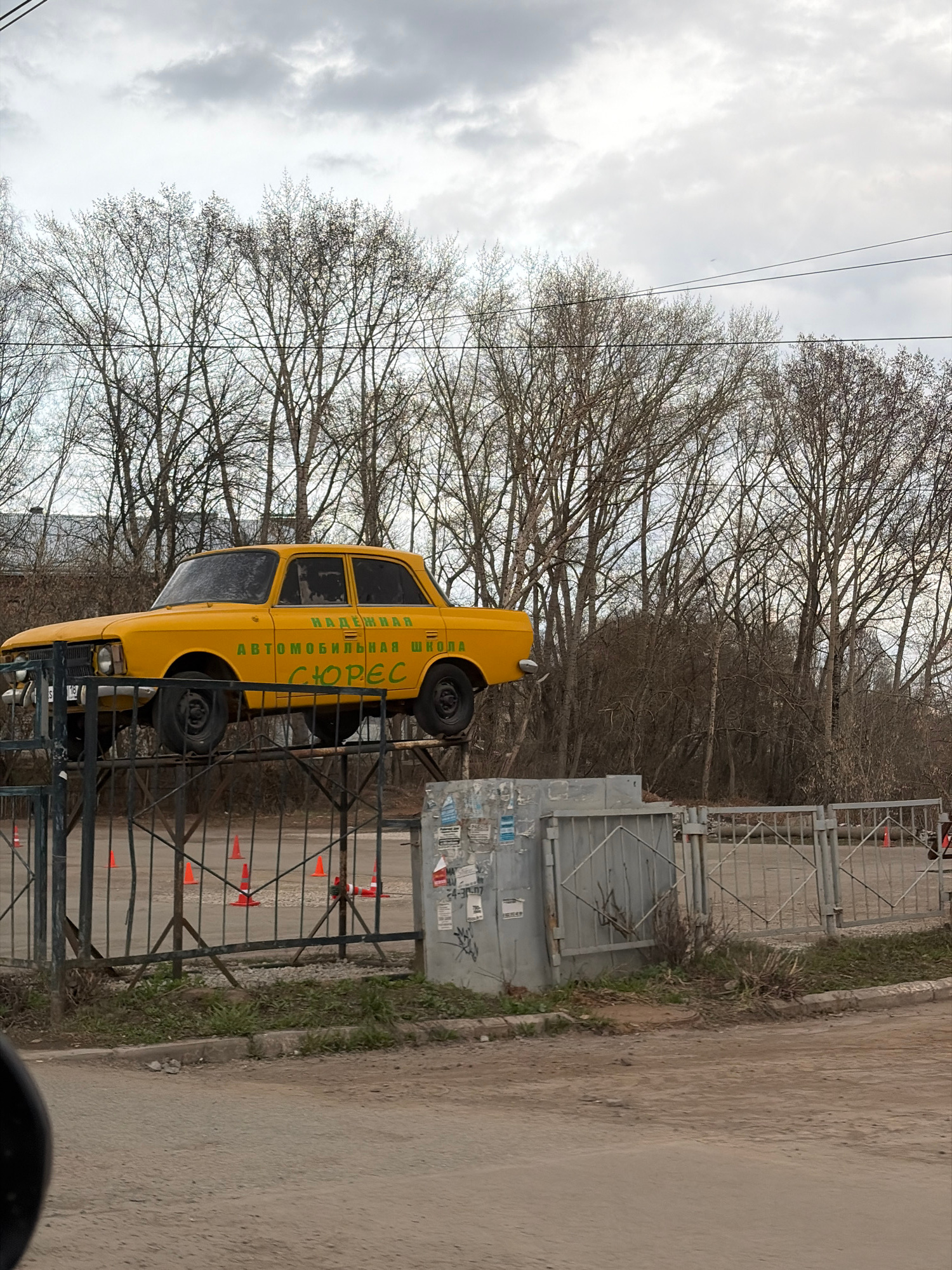 A yellow Moskvich 2140 car is mounted on a metal fence beside a road in Izhevsk, Russia. The car has green writing on its side in Russian, identifying it as a driving school. The fence is made of vert…read more