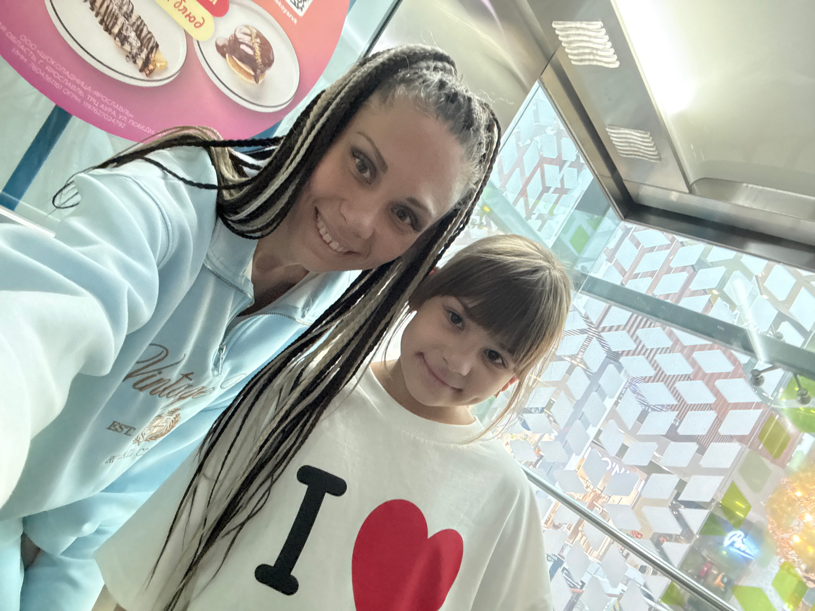 A selfie-style image features two females, an adult and a child, smiling brightly. The adult, positioned in the foreground, has long dark and light dreadlocks or braids and is wearing a light blue zip…read more