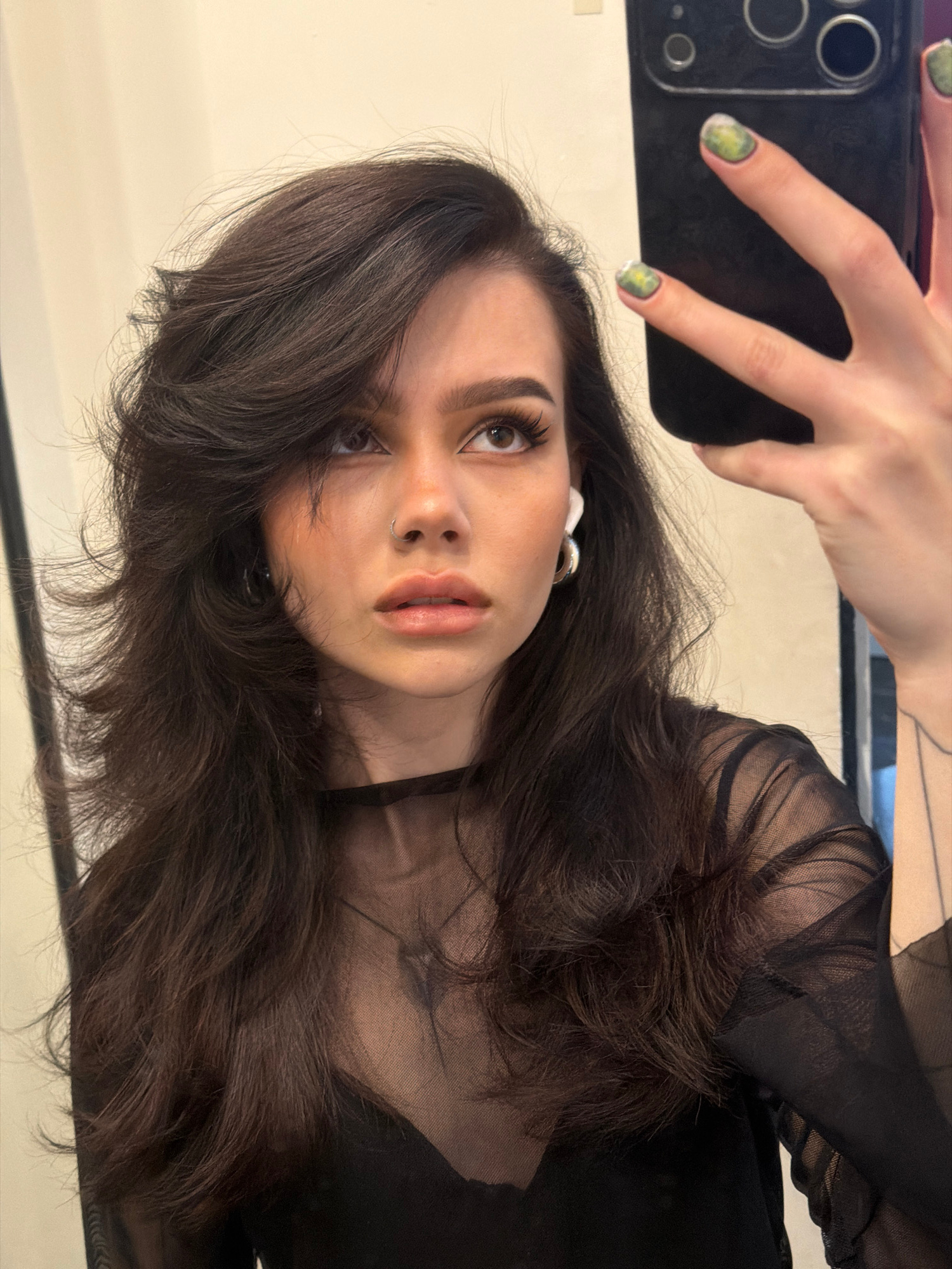 A young woman with long, dark brown hair is holding up a smartphone to take a selfie. She has light skin, brown eyes, and a pierced nose. She wears a black, sheer, long-sleeved top. The smartphone is…read more