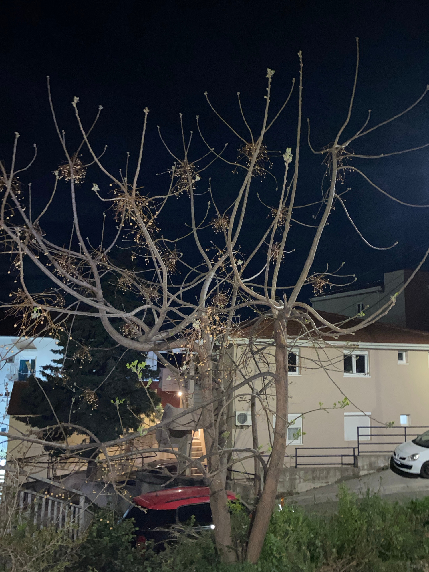The image depicts a night scene in what appears to be a residential area. A tree with bare branches and clusters of small, round seed pods is prominently featured in the foreground. Behind the tree, t…read more