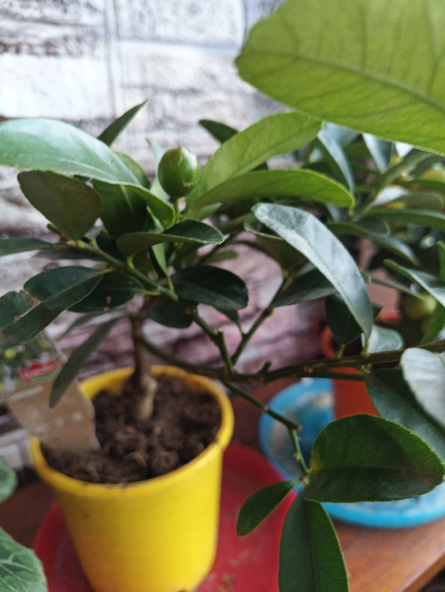 The image captures a close-up of a small citrus plant, likely a lemon or lime, growing in a vibrant yellow cylindrical pot. The plant is lush with numerous dark green, ovate leaves. A single, small, u…read more