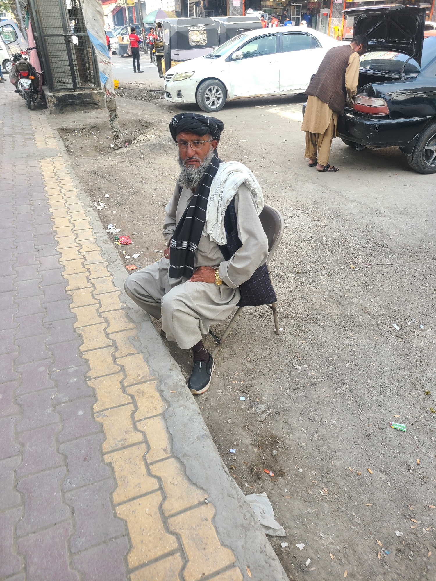 The image, taken in what appears to be Quetta City Tehsil, Pakistan, captures a street scene dominated by an older man seated on a simple chair by the roadside. The man has a grey beard, wears glassesβ¦read more