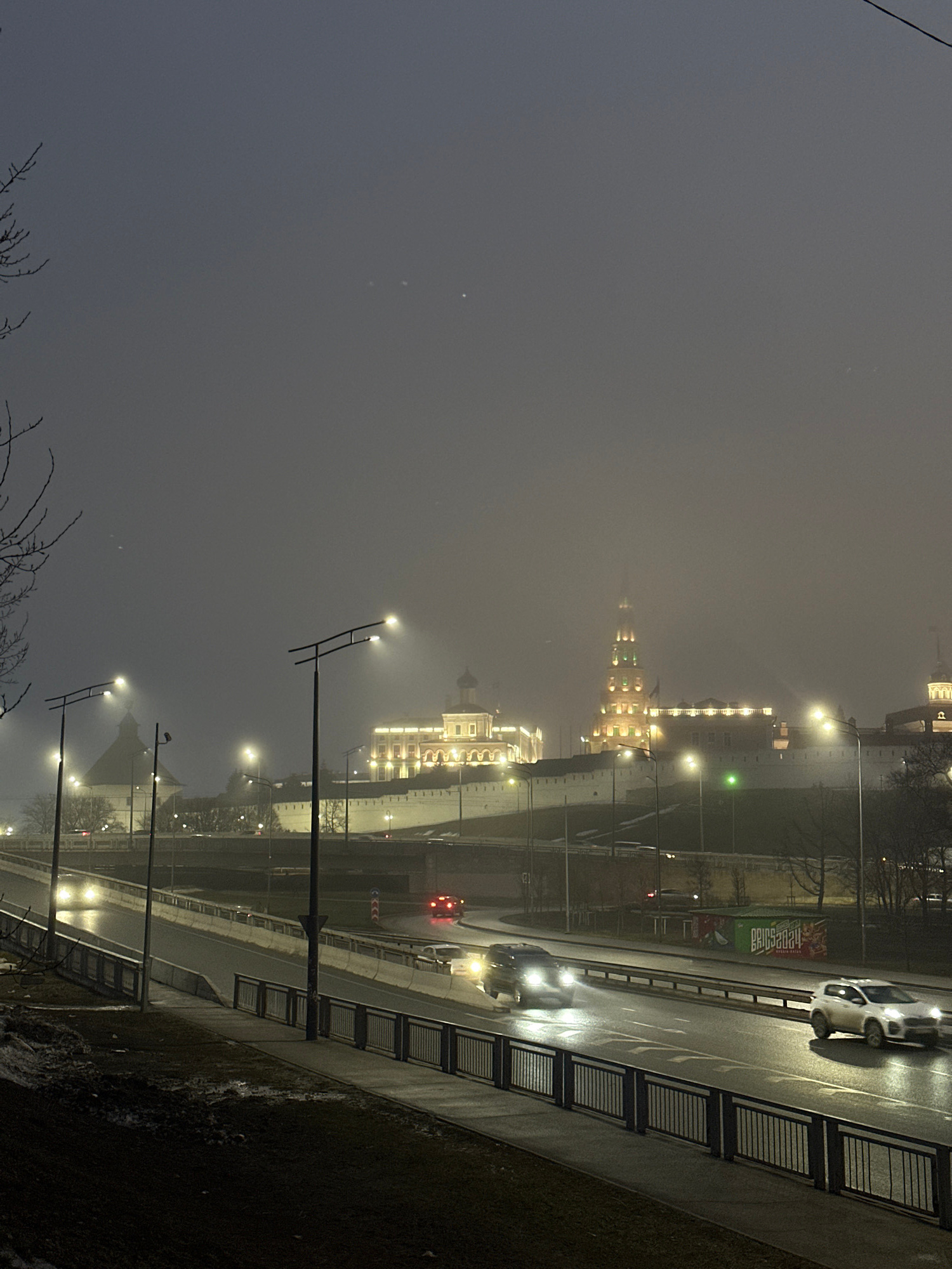 A nighttime scene in Kazan, Russia, captured on a foggy or hazy night. The illumination from streetlights and buildings casts a yellowish glow through the fog. In the background, the illuminated tower…read more