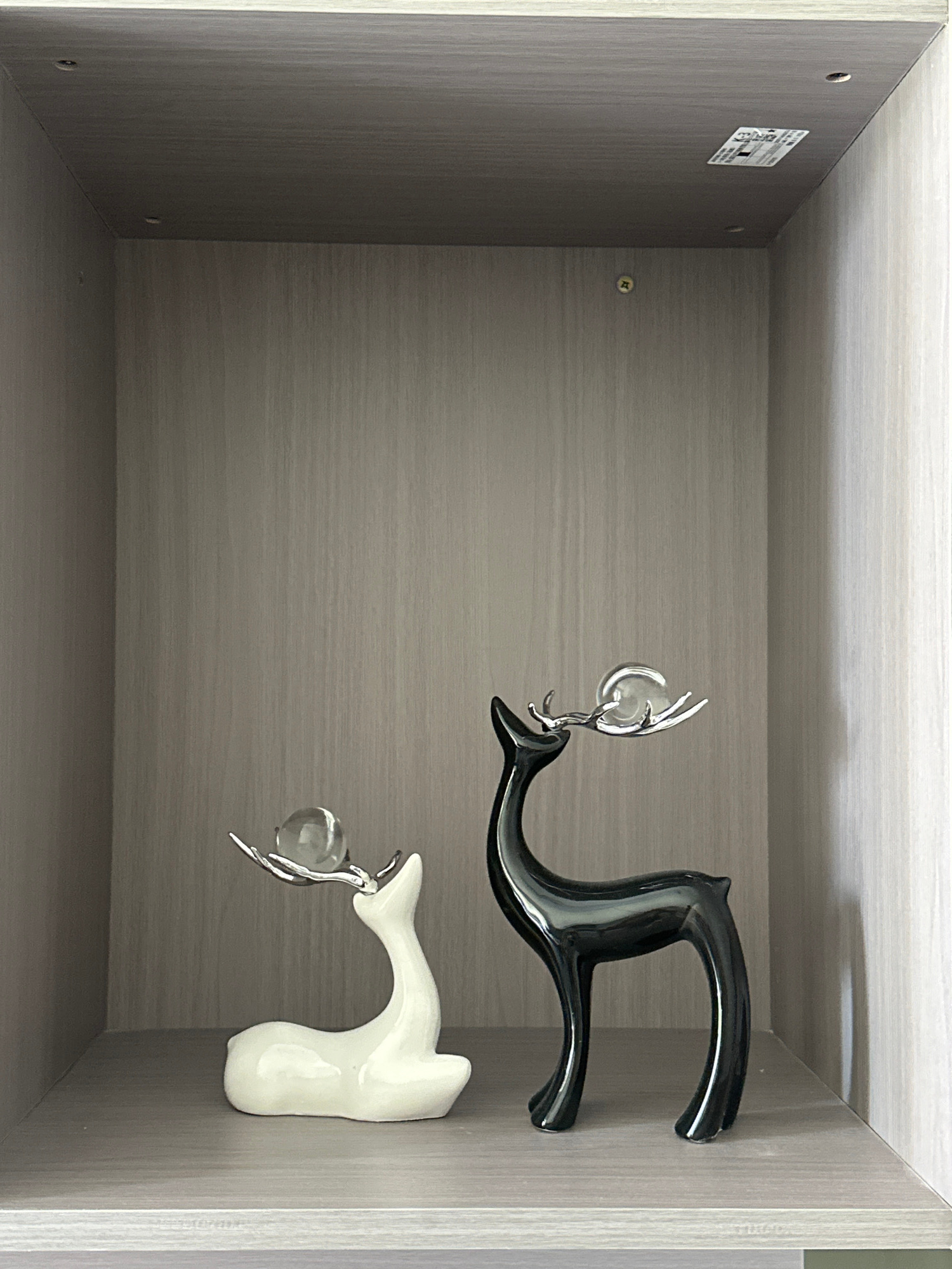 A top-down shot of an open, empty gray wooden drawer. Two decorative objects, shaped like stylized birds or dolphins holding a clear ball, are resting against the right side of the drawer. One is blacβ¦read more