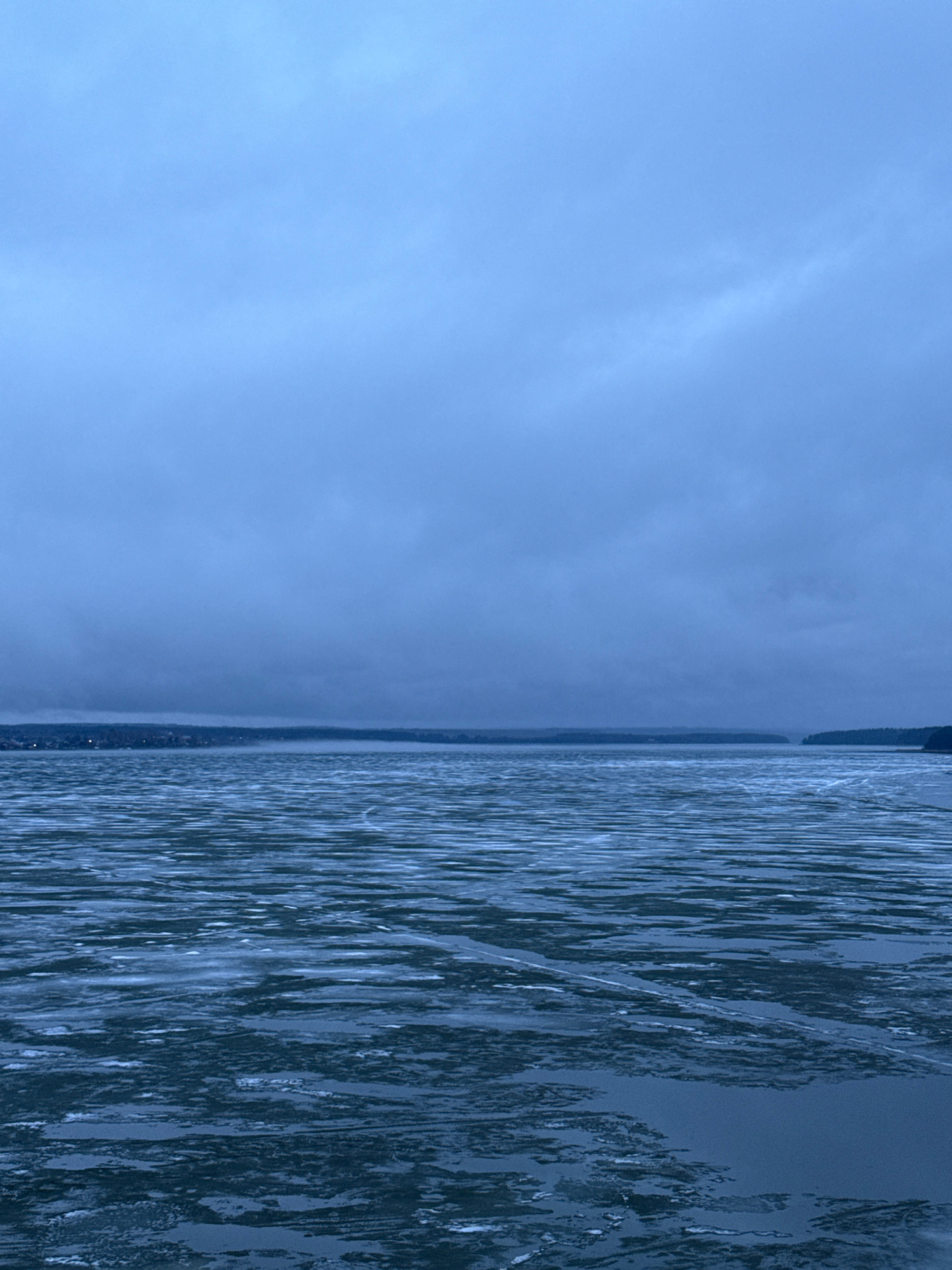 The image shows a body of water, possibly a lake or river, partially covered with ice, next to the city of Votkinsk, Russia. The sky is overcast and blue-toned. A strip of land is visible on the horizβ¦read more