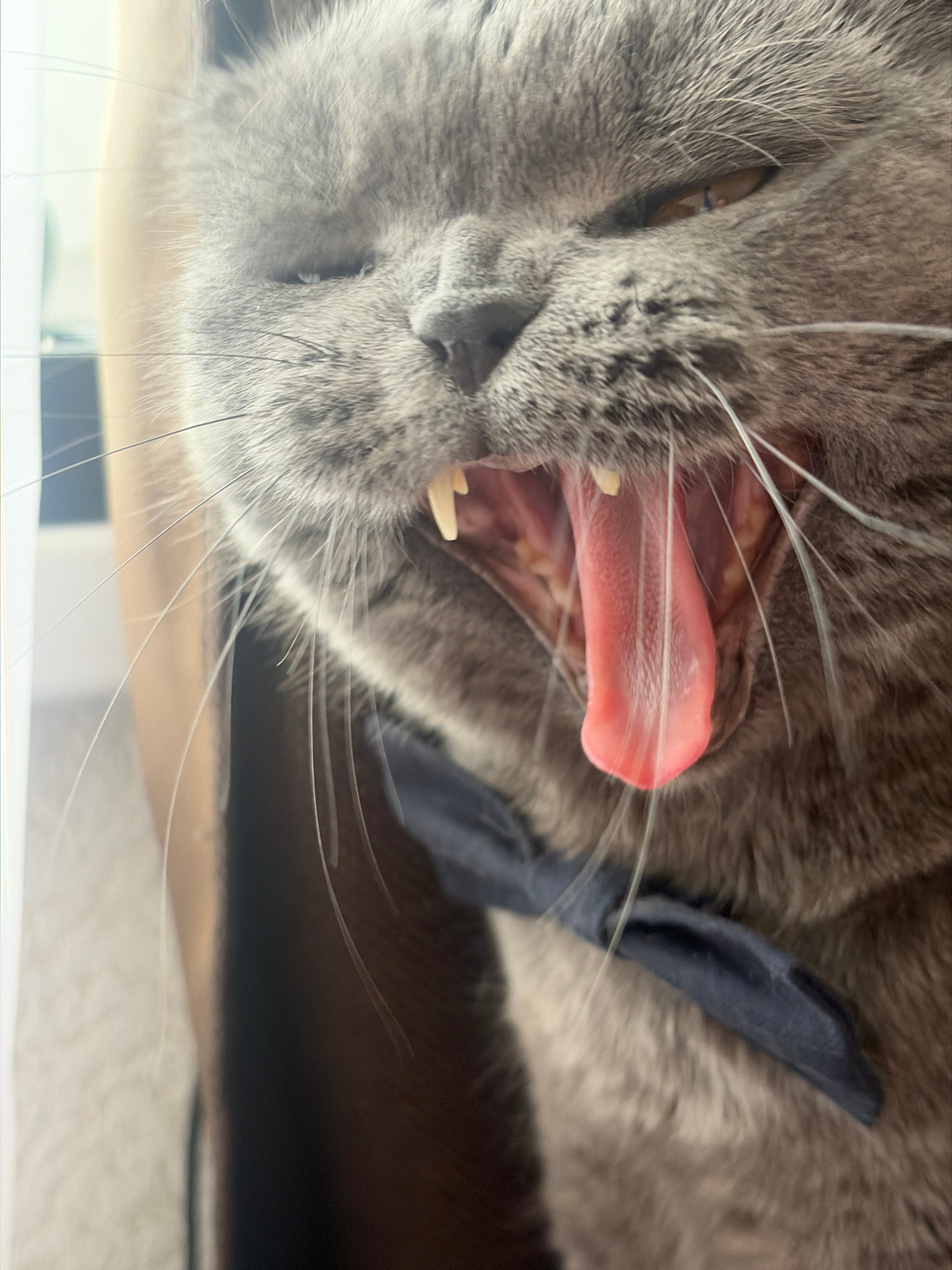 A close-up shot depicts a grey cat with its mouth open, revealing its tongue and teeth. The cat appears to be wearing a dark blue collar. The background is blurred, revealing a shelf and a hint of a w…read more