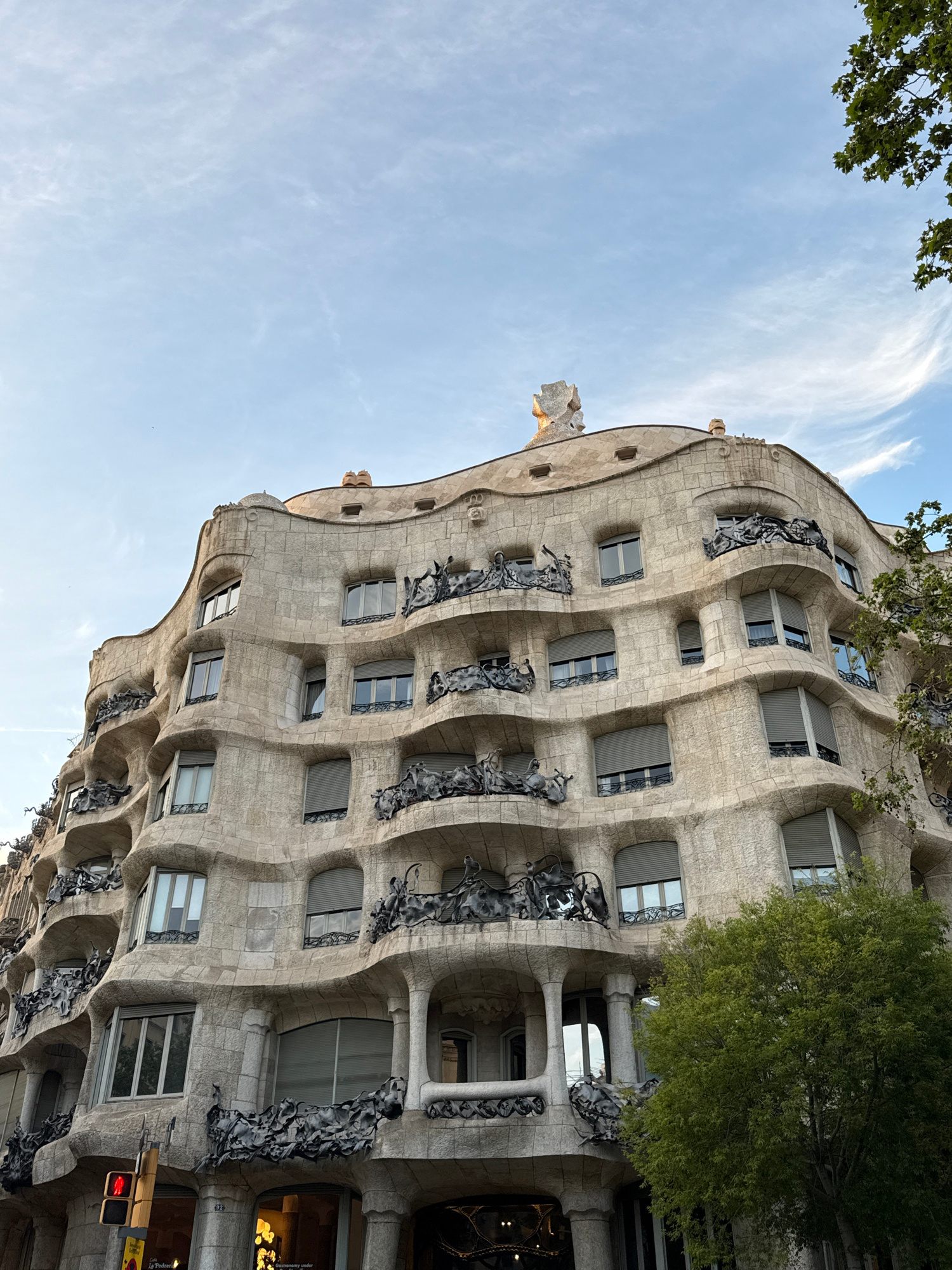 The image shows a portion of the Casa Milà, also known as La Pedrera, a modernist building in Barcelona, Spain, designed by Antoni Gaudí. The exterior is made of light-colored stone with undulating, w…read more