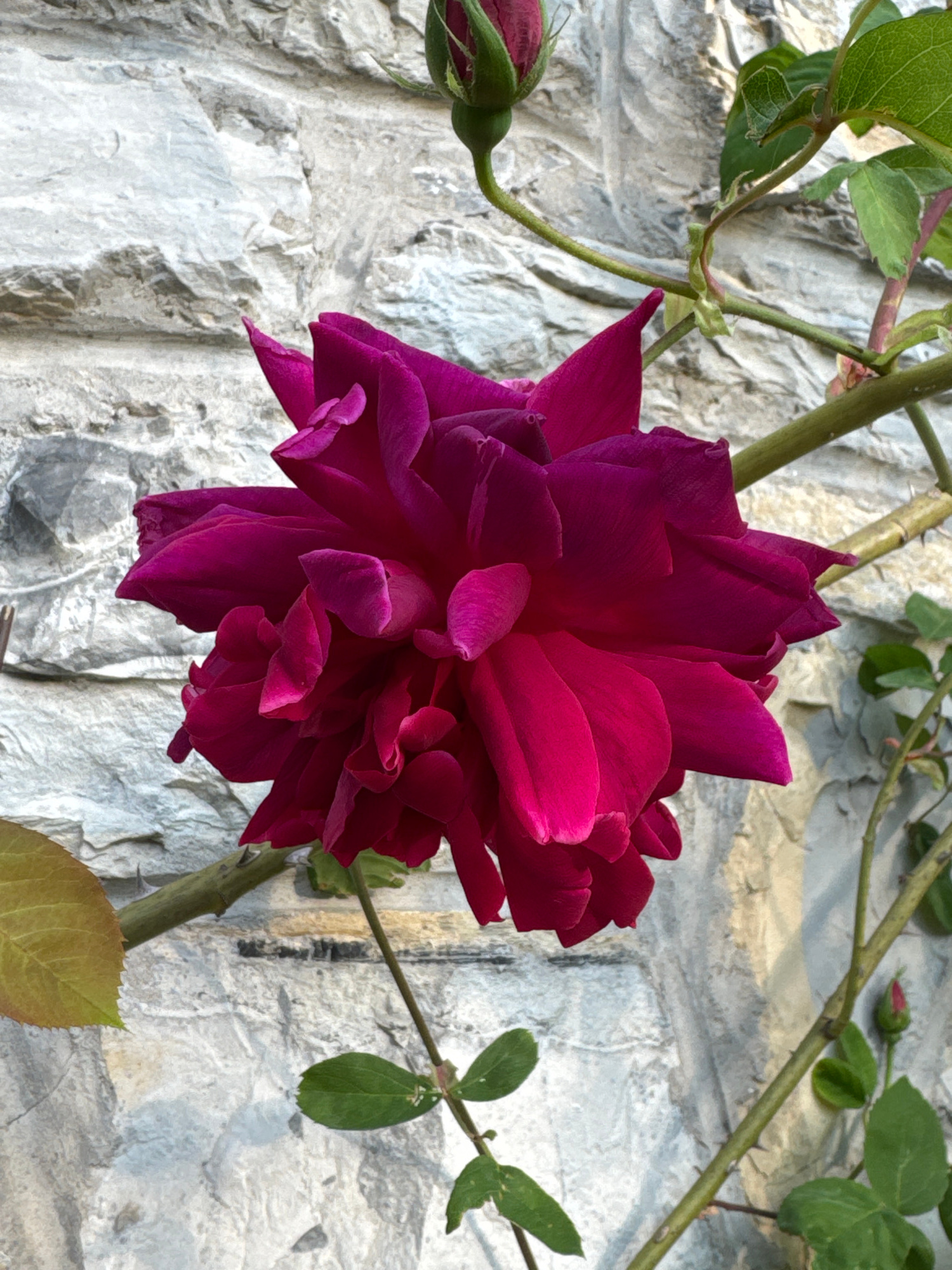 A close-up shot shows a vibrant, fully bloomed, magenta-colored rose against a roughly textured, white stone wall. The rose is attached to a green stem with thorns. Leaves and a closed rose bud are vi…read more