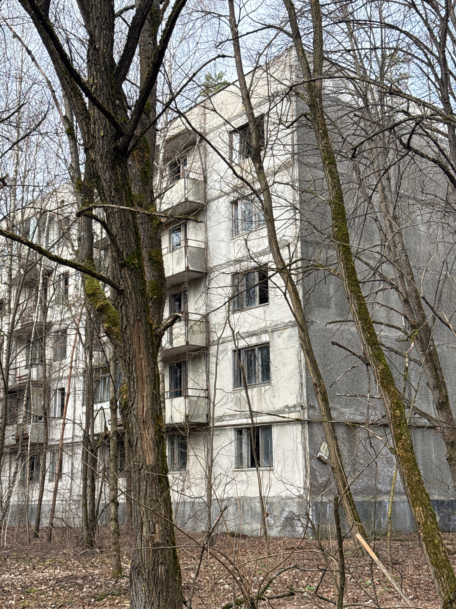 The image shows a multi-story building in Prypiat, Ukraine, viewed through a dense network of bare tree branches. The building has a dilapidated appearance, with visible decay and broken windows. The…read more