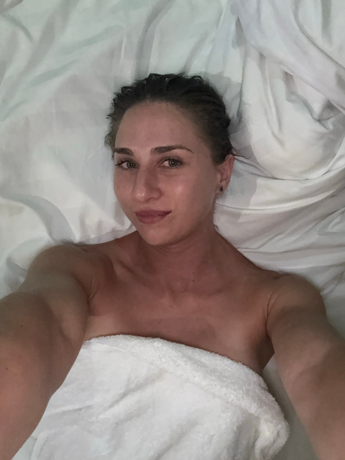 An adult female is depicted in an overhead selfie, lying supine on white, rumpled bed sheets within an indoor bedroom setting in Kamala, Thailand. Her dark hair is wet and pulled back from her face. S…read more