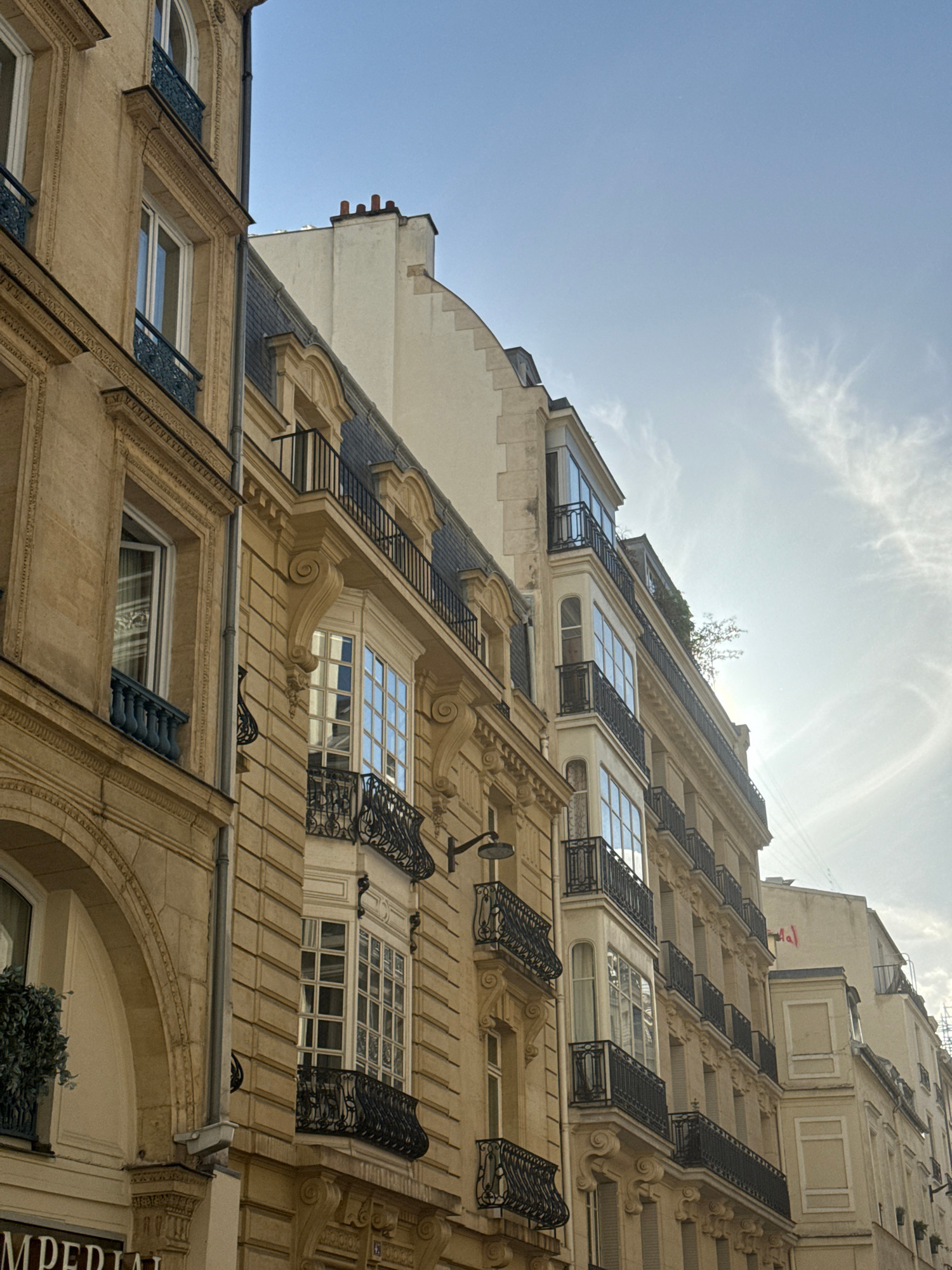 This low-angle photograph captures the ornate facade of a multi-story building, likely an apartment block or hotel, under a bright, sunny sky. The building, characteristic of Parisian architecture, is…read more