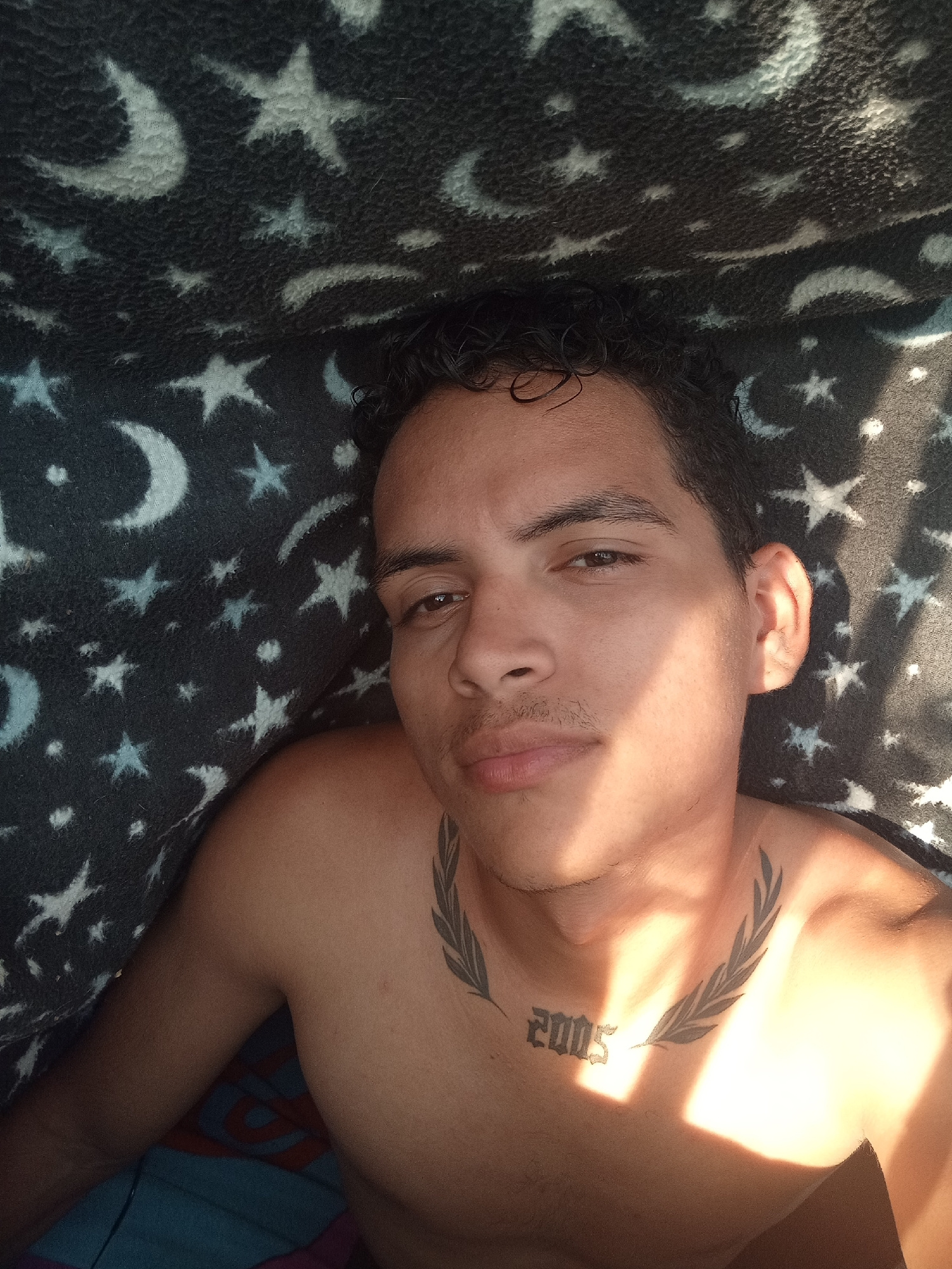 A young adult male is depicted in a close-up, overhead view, lying on his back. He has short, dark, curly hair and light facial stubble on his upper lip and chin. His eyes are open, and he is looking…read more