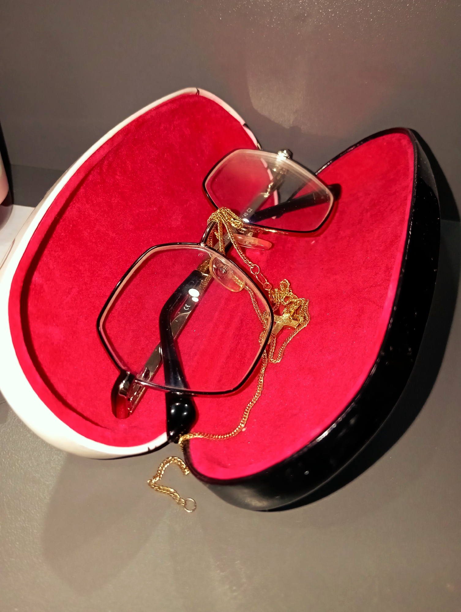 A pair of gold-rimmed eyeglasses lies inside an open eyeglasses case lined with red felt. A gold chain is draped over the glasses and extends outside the case. The case has a black exterior and a whit…read more