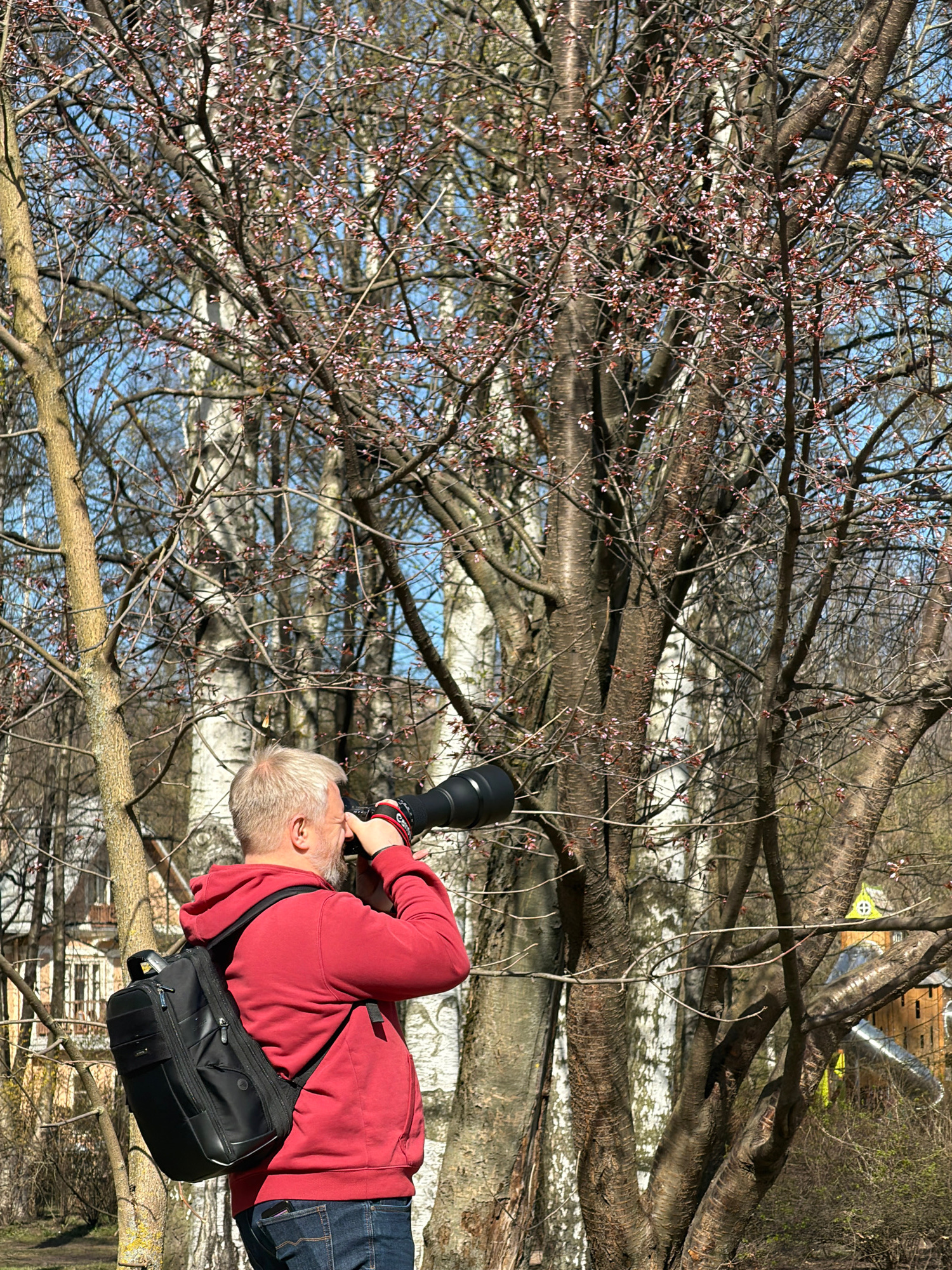The image captures a male photographer actively engaged in nature photography in what appears to be an urban or park setting, possibly along a canal or river in Saint Petersburg, Russia. The man, seen…read more
