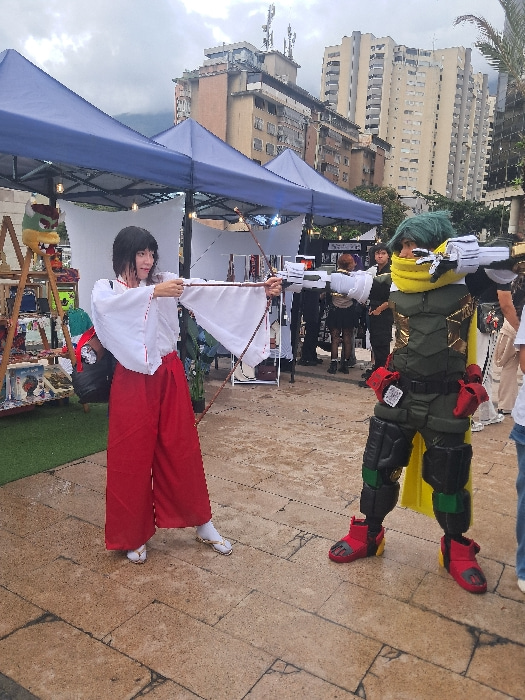The image shows two people in cosplay outfits at an outdoor event. One individual is dressed as Izuku Midoriya (Deku) from "My Hero Academia," wearing the character's signature green and black hero co…read more