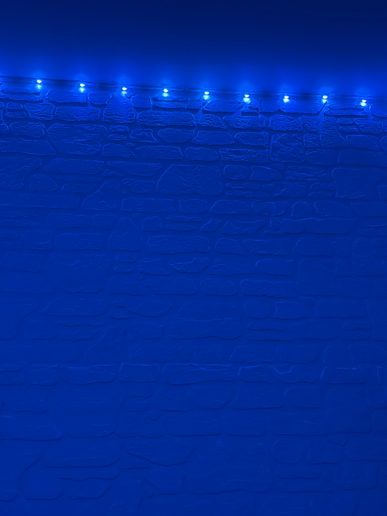 A close-up shot displays a textured blue wall, with a string of illuminated blue lights positioned along the left edge. The wall's texture resembles irregular stone or brickwork.