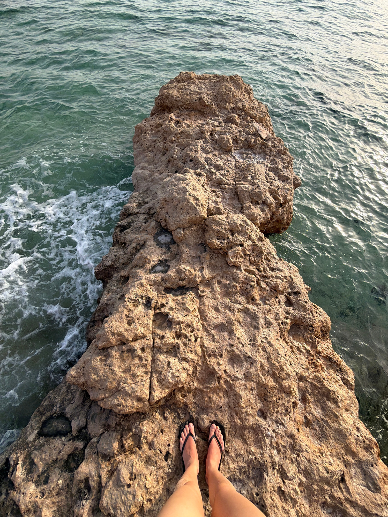 A top-down, high-angle shot captures a rocky outcrop jutting into the sea. The rock is light brown and porous, with multiple crevices and indentations. It slopes slightly upwards from left to right. T…read more