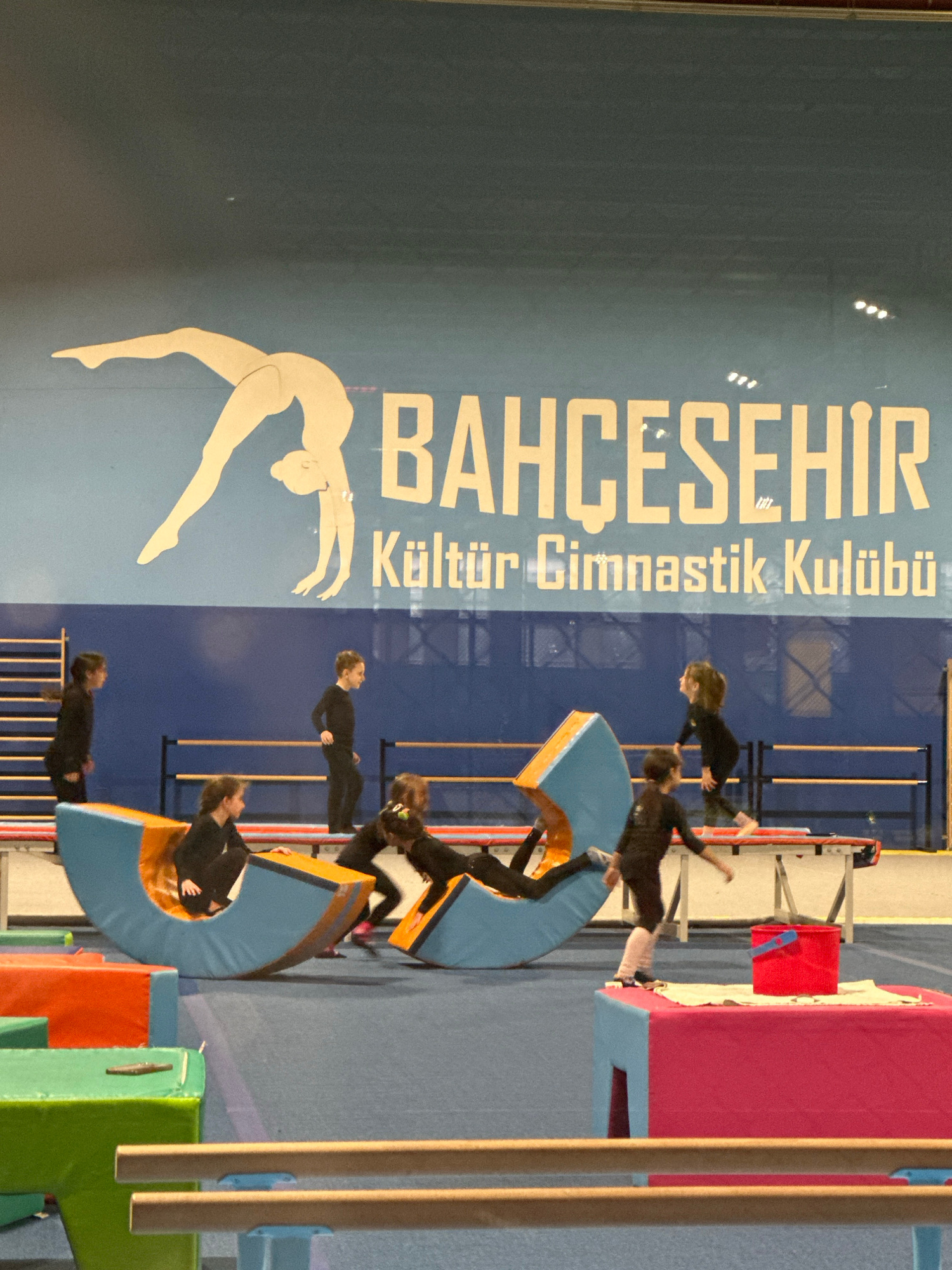The image depicts an indoor gymnastics facility identified by a large wall mural reading "BAHÇEŞEHİR Kültür Cimnastik Kulübü" (Bahçeşehir Culture Gymnastics Club) in the Bahçeşehir district of Esenyur…read more