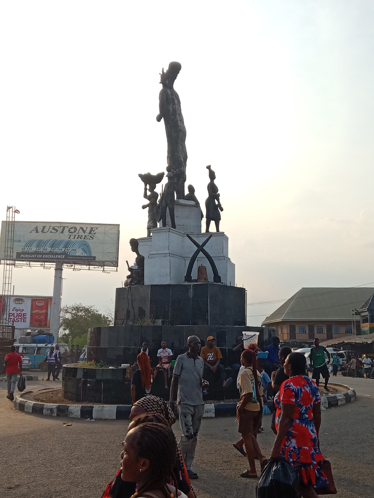 The image captures a bustling scene at the Denis Memorial Grammar School (DMGS) Roundabout in Onitsha, Nigeria. The focal point is the roundabout's monument, a tall sculpture composed of several figur…read more