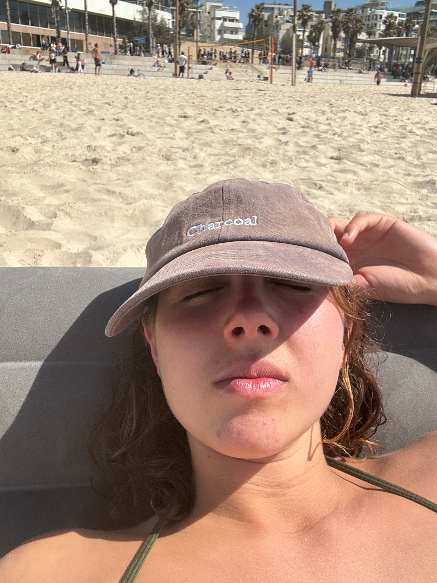 The image presents a close-up, first-person perspective of a young adult female resting on a beach, with a bustling urban beach scene in the background. In the foreground, a female subject is seen fr…read more