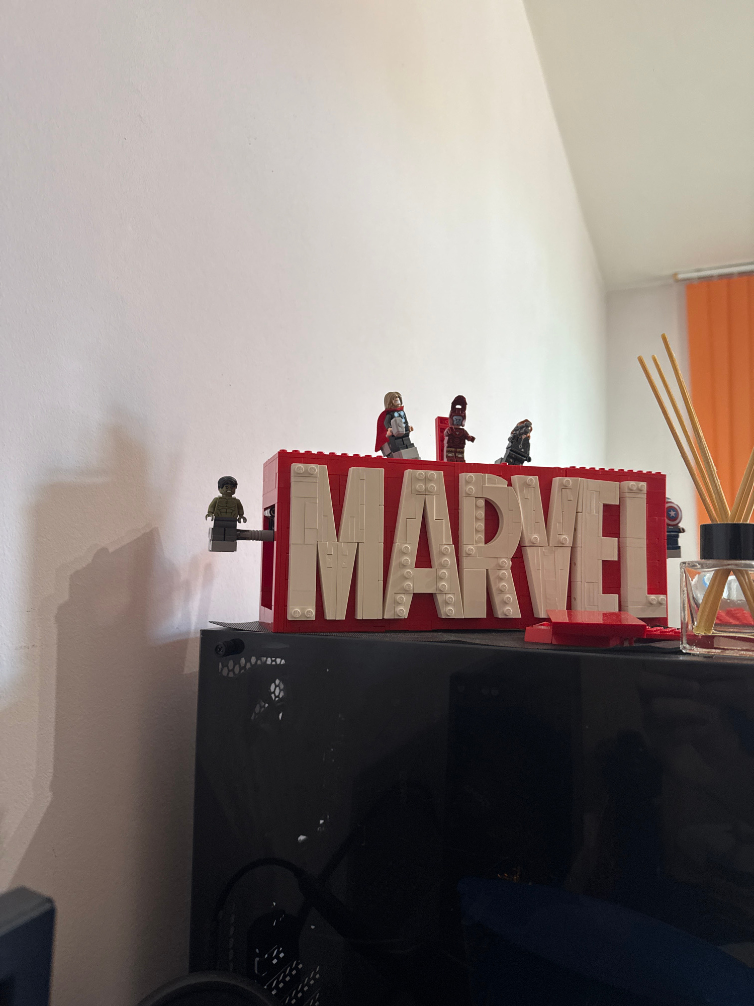 A Lego Marvel sign sits on top of a black computer tower. The sign is red with white Lego bricks forming the letters "MARVEL." There are several Lego minifigures attached to the side of the sign. A di…read more