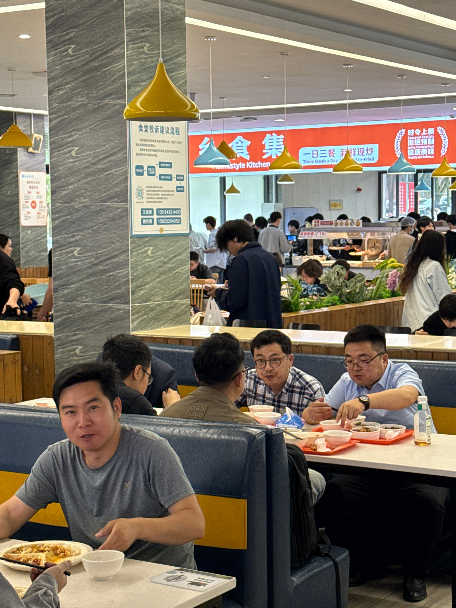 The image captures a bustling scene in a cafeteria, likely in a college or university setting based on the age of the individuals present. The location is Jiangjin, China, based on the Chinese text pr…read more