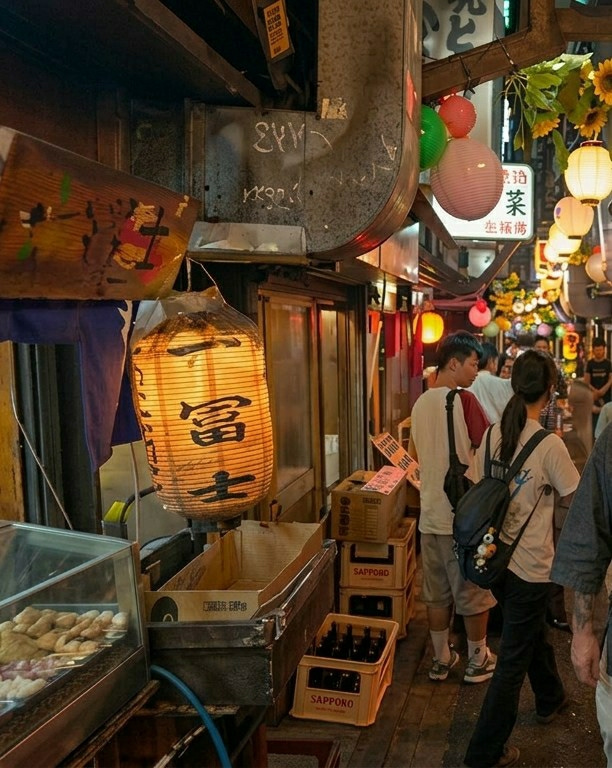 The image presents a narrow, illuminated commercial alleyway in Shinjuku, Japan, indicative of a bustling evening street scene. The ground is composed of dark, worn planks. In the left foreground, a glass display case contains multiple skewers of various food items. Above this, a large, glowing cylindrical paper lantern hangs, displaying the Japanese kanji "富士" (Fuji). To its left, a rectangular wooden sign with painted Japanese characters and designs is mounted overhead. A blue hose is visible near the bottom of the display case. The midground features several individuals. A person with dark hair in a ponytail, wearing a light t-shirt, dark trousers, and a black backpack adorned with small figures, walks away from the viewer towards the right. To their left, a male in a white t-shirt with red trim, light shorts, and a black fanny pack stands facing left. Behind them, stacks of beige plastic crates, many marked "SAPPORO" and containing brown glass bottles, are arranged alongside cardboard boxes. Overhead, a prominent curved metallic ventilation duct with graffiti, including "ΣΨM" and "YK997", runs along the top of the scene. Further into the alley, numerous spherical paper lanterns in green, red, pink, and white hues are suspended. A white rectangular sign with vertical Japanese characters, notably "菜", is visible, accompanied by artificial yellow sunflowers or similar floral decorations. The background shows additional blurred figures, indicating pedestrian activity deeper within the brightly lit alley. A person in a gray jacket with a visible tattooed arm is partially seen in the immediate right foreground, moving rightward. | Open Wire