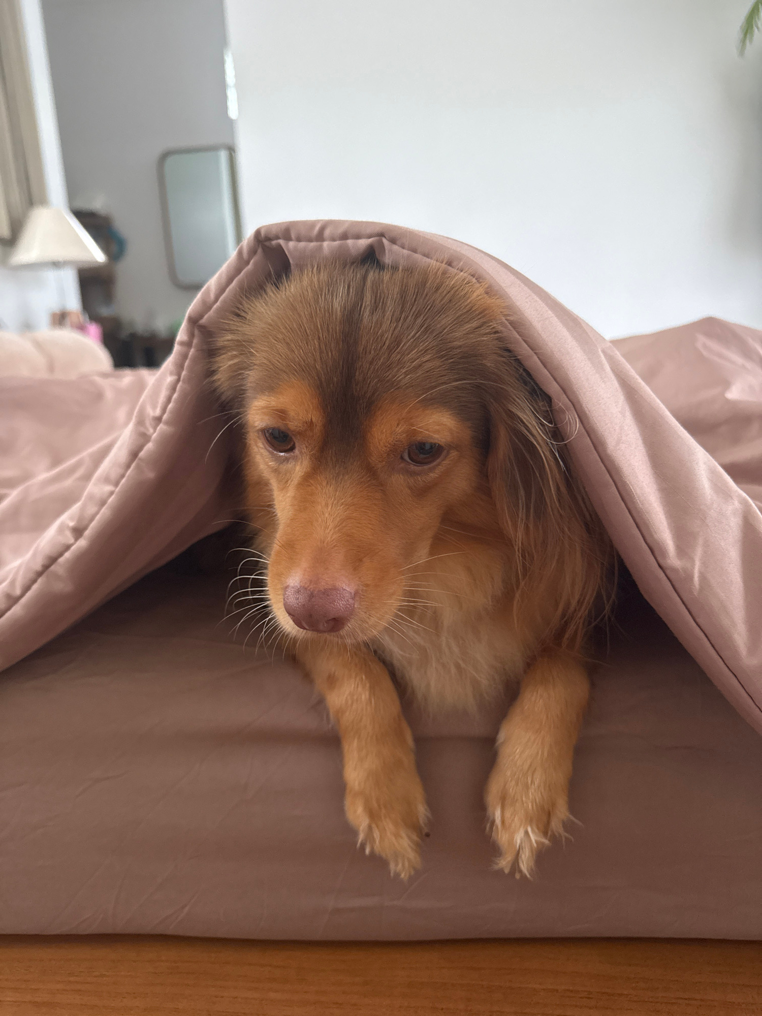The image displays a small to medium-sized dog with long, reddish-brown fur, tucked comfortably under a light brown or mauve blanket. The dog's head is resting on the blanket, and its front paws are v…read more