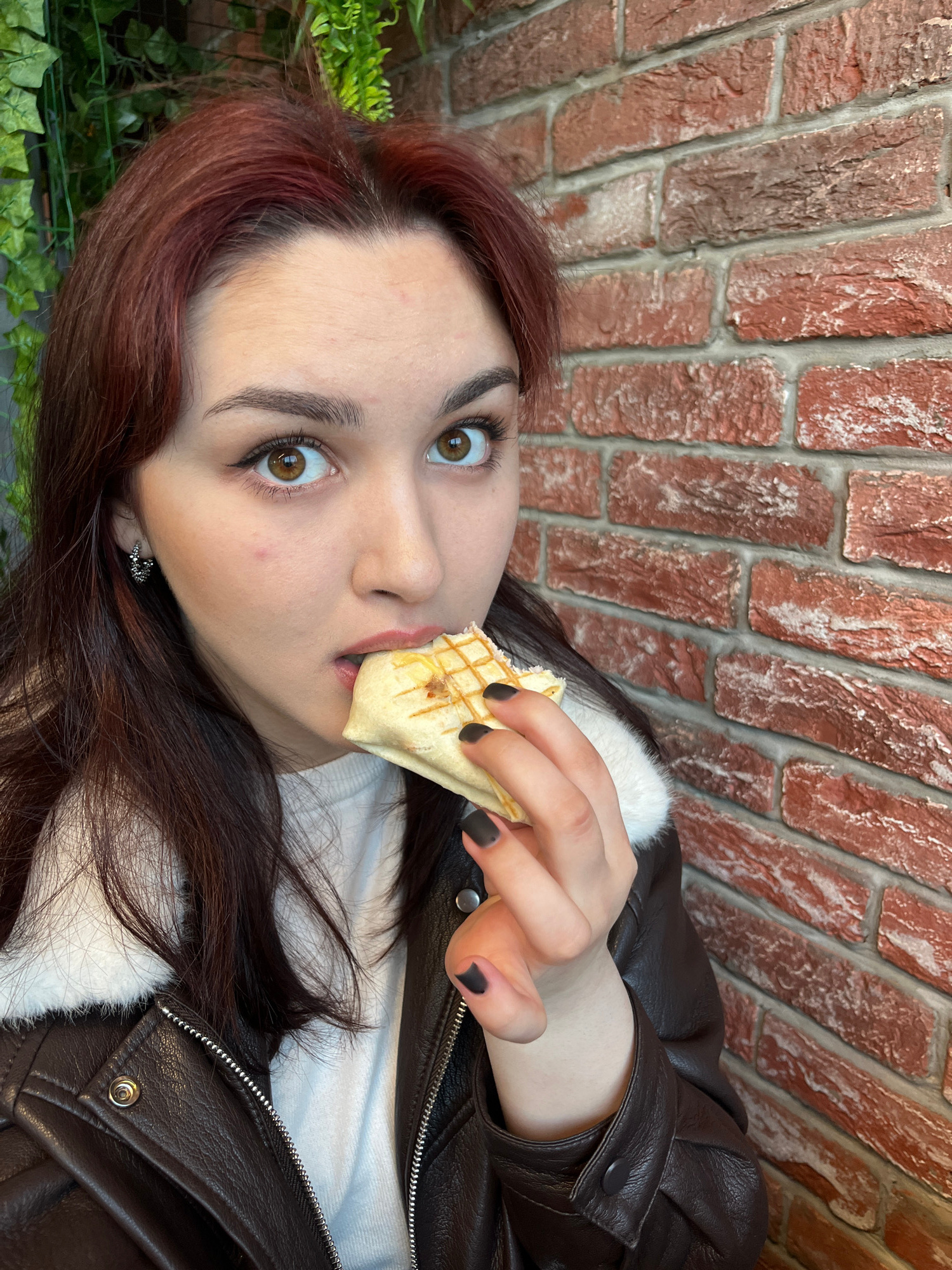 A young woman with auburn hair and brown eyes is shown eating a sandwich. She is wearing a white shirt and a brown leather jacket with a white furry collar. Her nails are painted black. She is positioβ¦read more