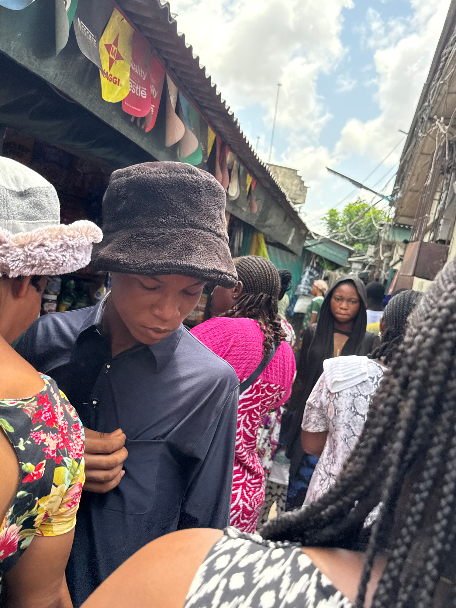 The image depicts a bustling outdoor market scene, characteristic of a vibrant urban environment like Lekki, Nigeria. The perspective is from within a crowd, looking towards market stalls and other pe…read more