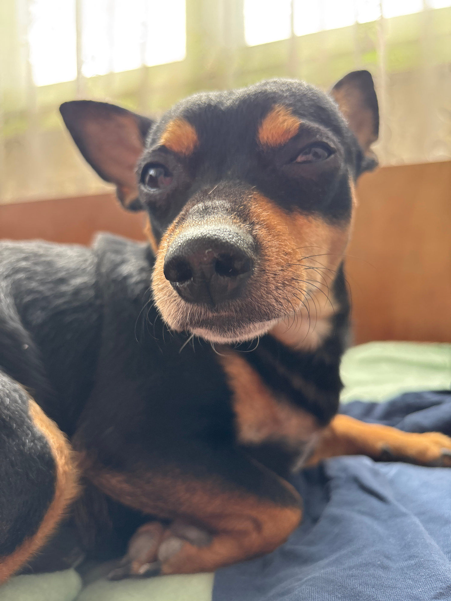 A close-up, slightly tilted shot shows a black and tan Miniature Pinscher dog. The dog's head, with its shiny black nose and inquisitive eyes, is the primary focus. Traces of its legs can be seen curl…read more