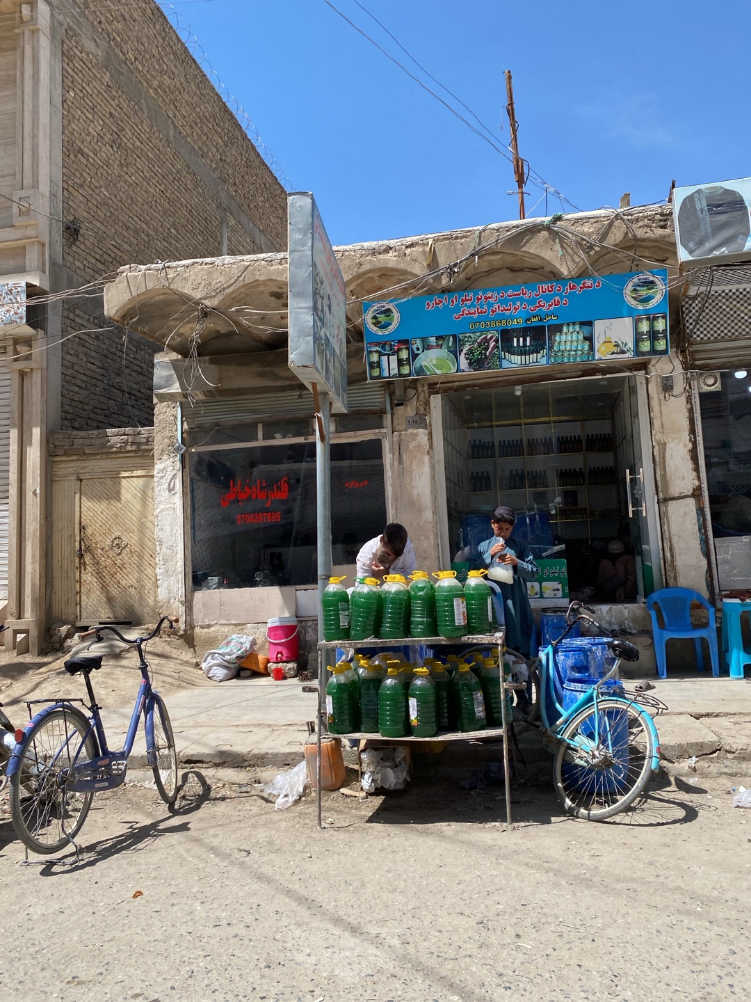 The image captures a street scene in Kandahar, Afghanistan, with a focus on a small business establishment. Two men are present: one is standing behind a metal cart laden with large, green liquid-fill…read more