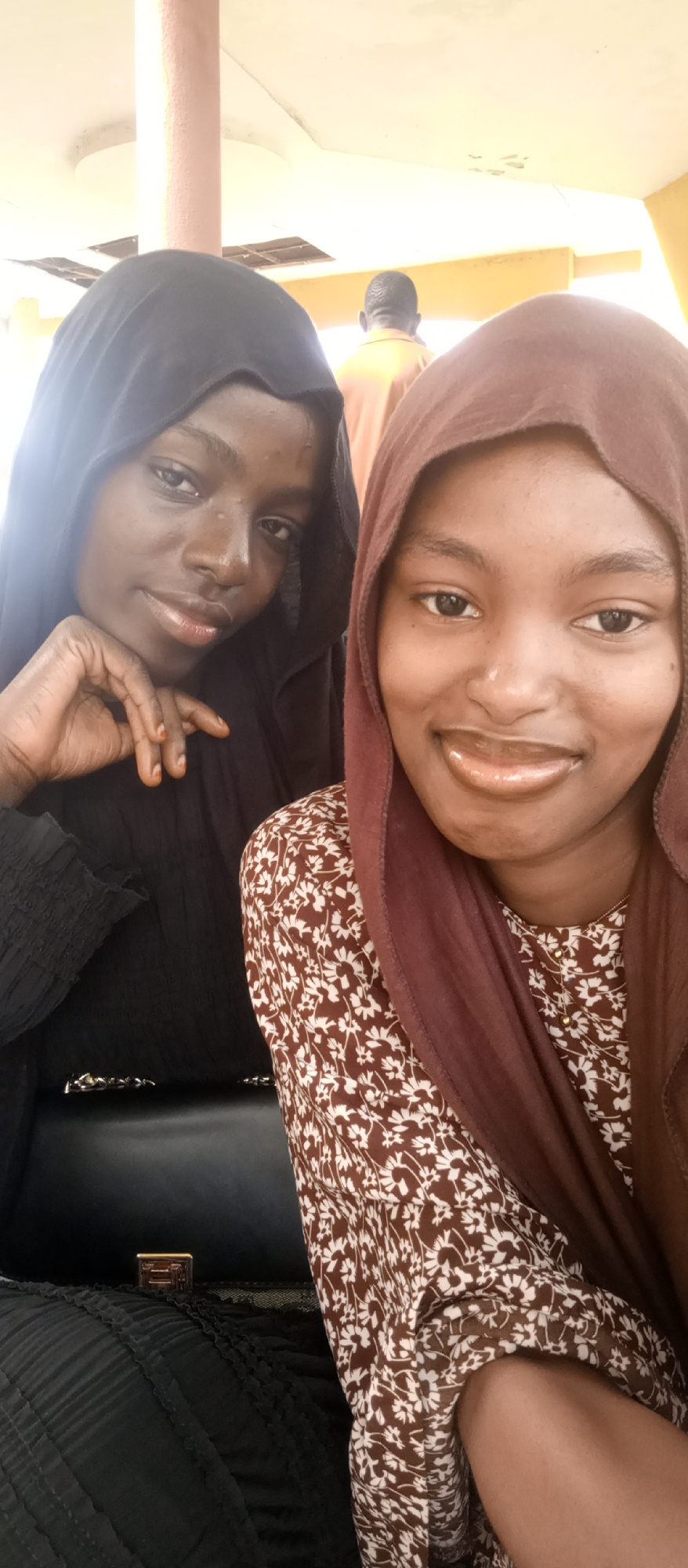 Two young women are prominently featured in a photo, likely a selfie, smiling directly at the camera. The setting appears to be indoors or under a covered outdoor structure, characterized by a bright,…read more