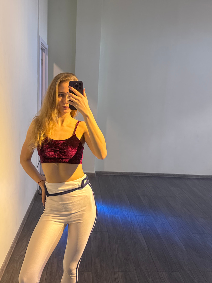 A full-body mirror selfie depicts a young adult female in an Unknown location in Unknown, Unknown. The subject, possessing long blonde hair, is partially obscured by a dark-colored smartphone held in…read more