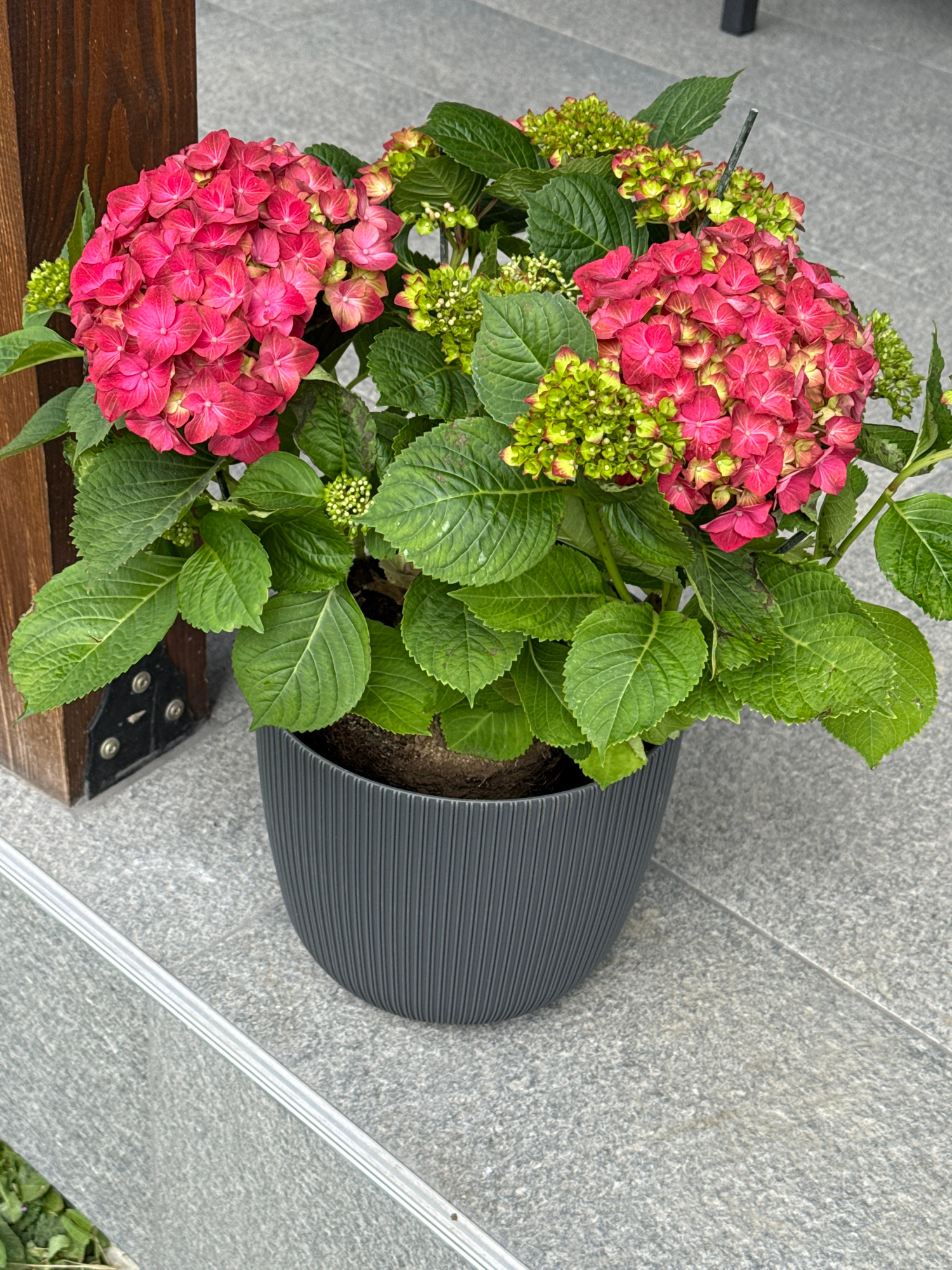 The media file presents an overhead view of a potted hydrangea plant situated on a light grey, speckled tiled surface. The plant is the central subject, showcasing large, vibrant clusters of deep pink…read more