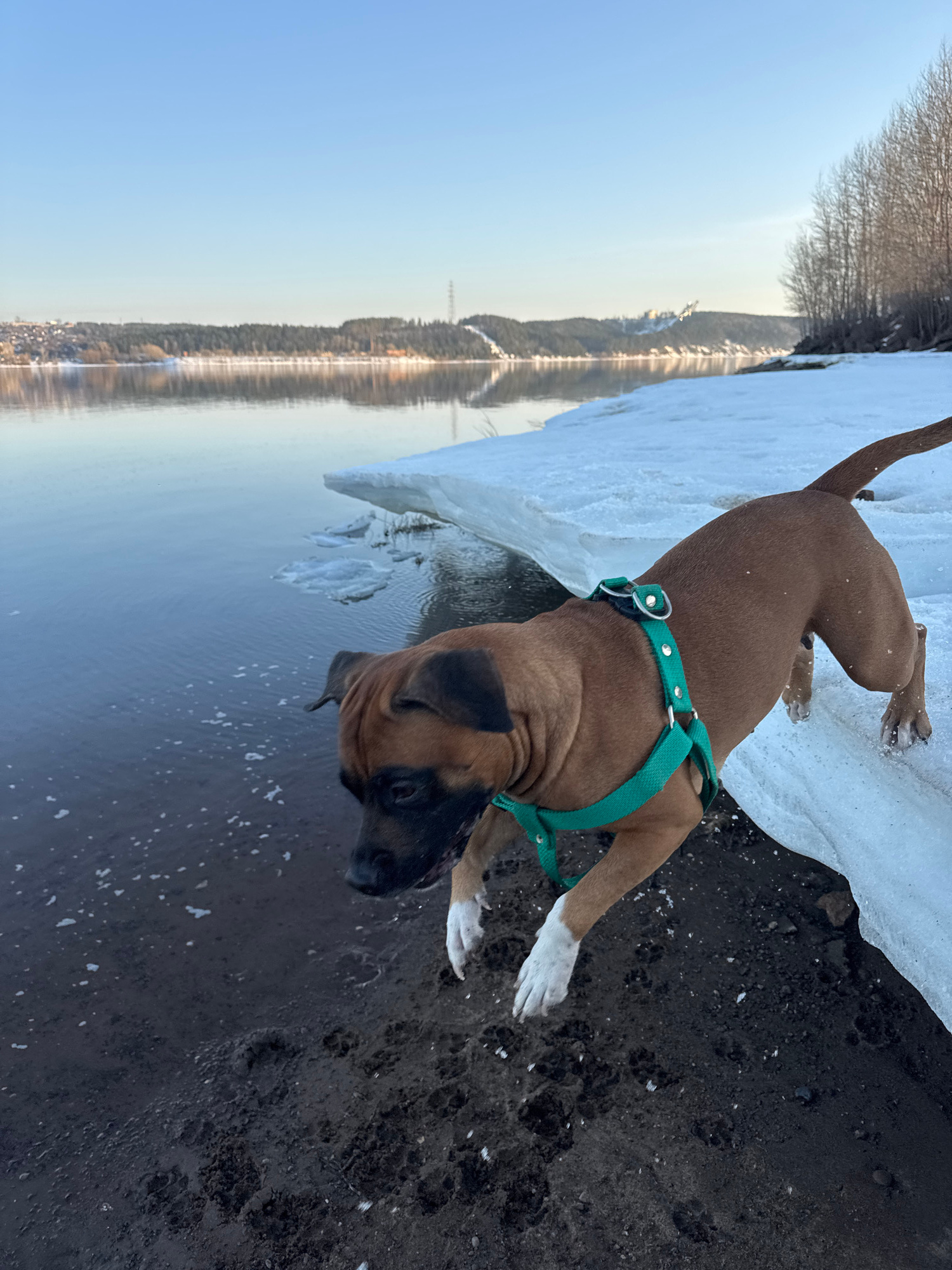 The image shows a brown boxer dog with a green harness standing on the edge of the Kama River in Chaikovsky, Russia. The dog is near a patch of melting ice on the riverbank. The river reflects a woode…read more