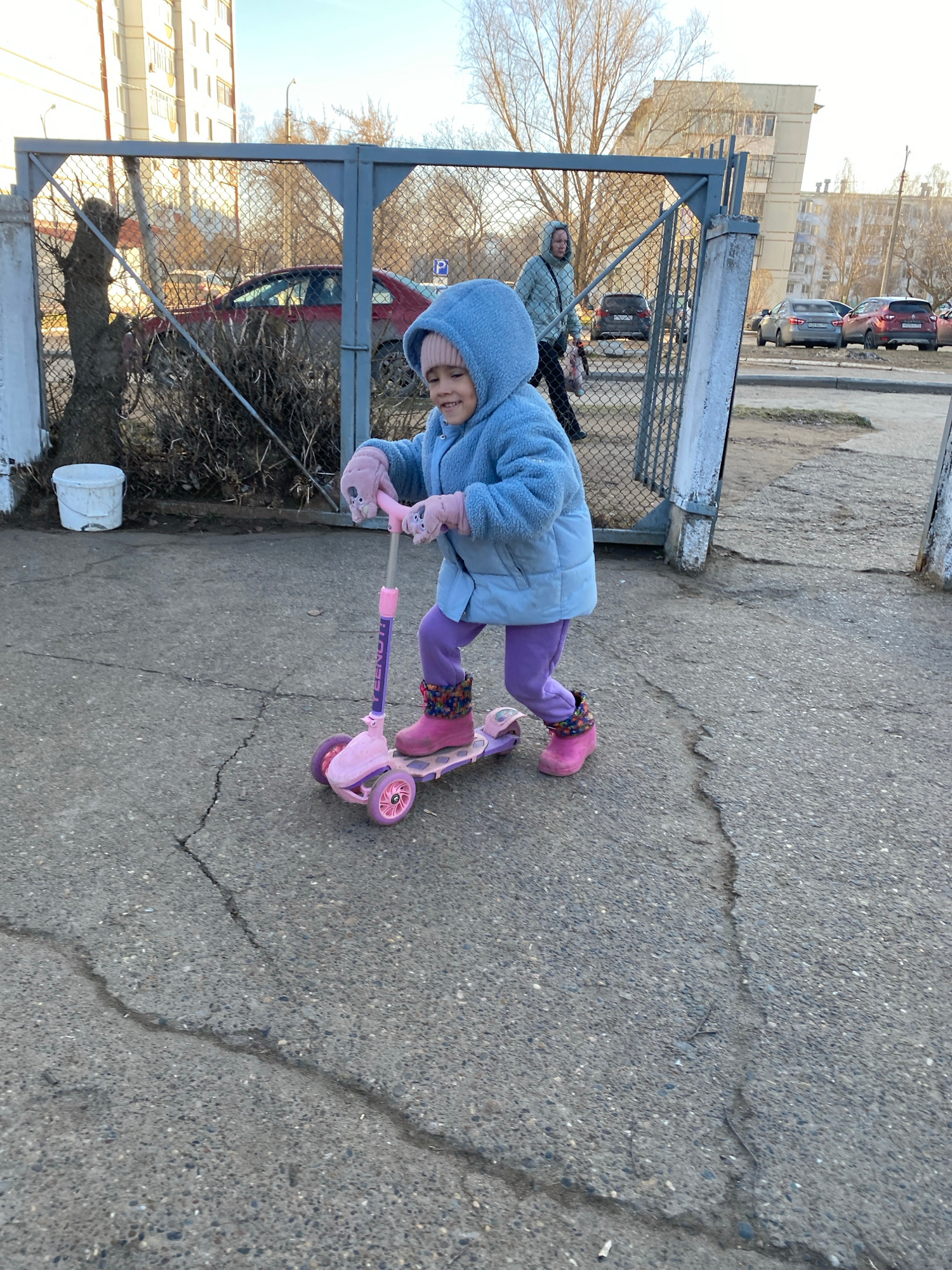 A young child in a blue hooded jacket, purple leggings, and pink boots is riding a pink scooter on a cracked concrete sidewalk. The scooter has a purple handlebar. The child is wearing pink mittens. B…read more