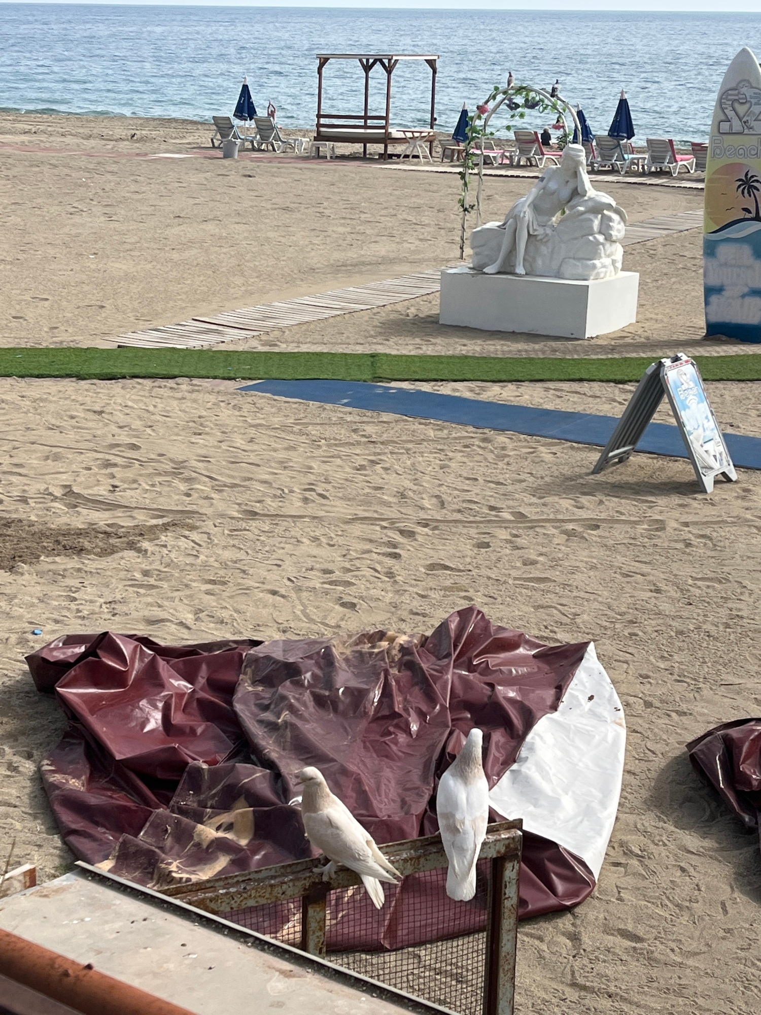 The image depicts a beach scene in Alanya, Turkey. In the background, there is a view of the ocean, sandy beach, beach chairs, and blue umbrellas. A decorative statue is positioned near the boardwalk.…read more