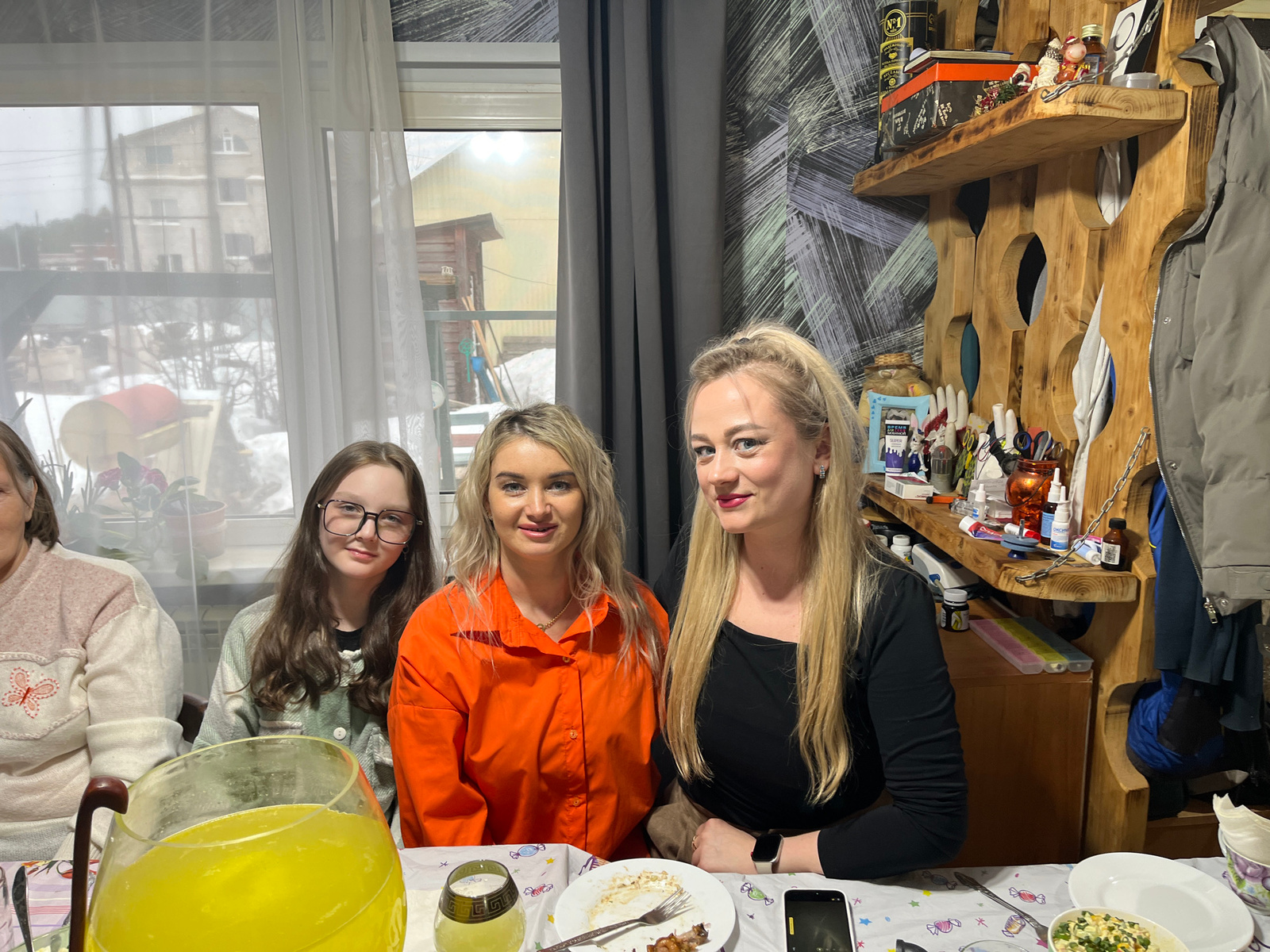 The image depicts a group of women and a girl seated around a table inside a room, likely in a residential setting. Three of the women are positioned prominently in the foreground, with another woman…read more