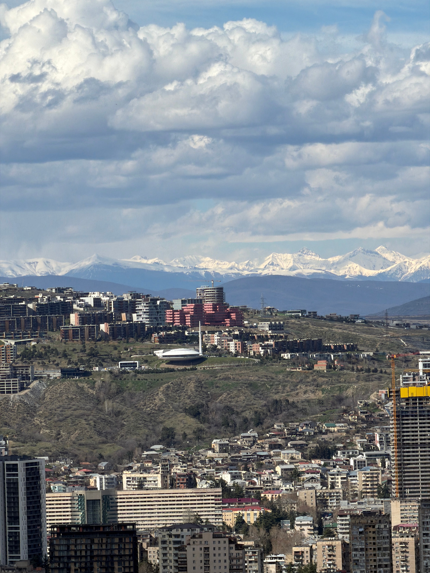 The image presents a cityscape with a dramatic view of Tbilisi, Georgia, oriented horizontally. The sky, filled with dynamic cloud formations, occupies the left side of the frame. Adjacent to the clou…read more