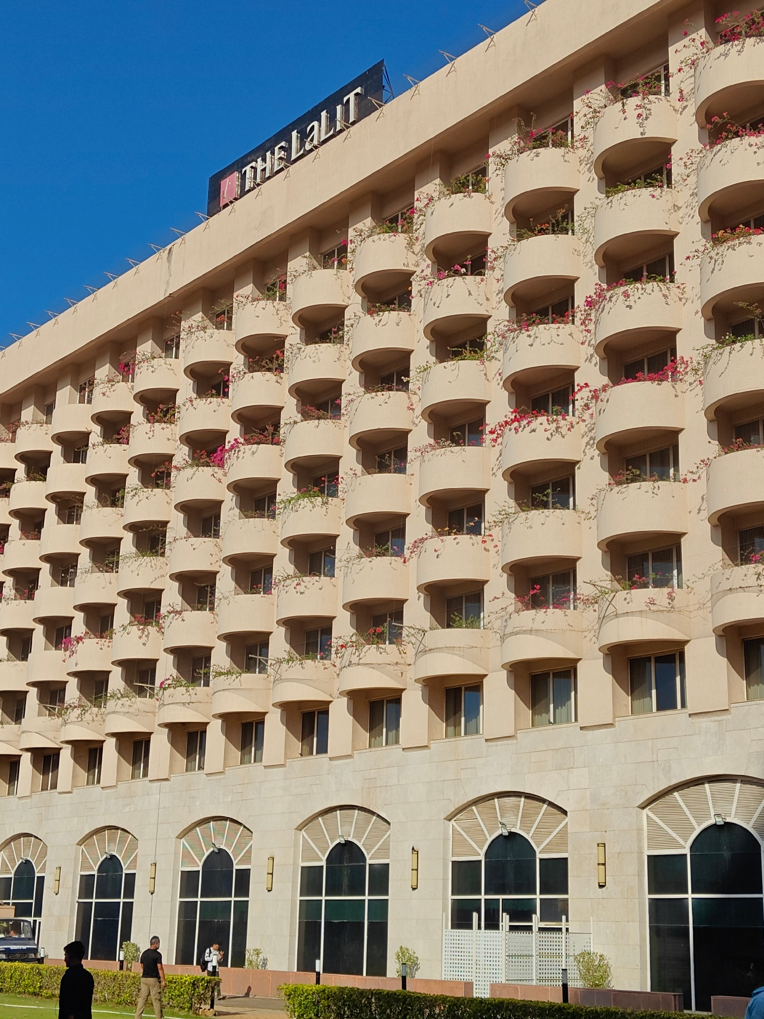 The image shows the facade of The Lalit Mumbai hotel in Mumbai, India. The building is light beige with numerous balconies, each adorned with plants, many bearing pink flowers. The top of the building has the hotel name, "THE LALIT," in large, dark letters. Below the balconies, the ground floor features large, arched windows. At the base of the building, green bushes line the edge of a grassy area. Several people are standing in this area, including a person in black attire and other individuals who seem to be walking or standing. In the background, a dark-colored vehicle is parked. The sky is a clear blue. | Open Wire