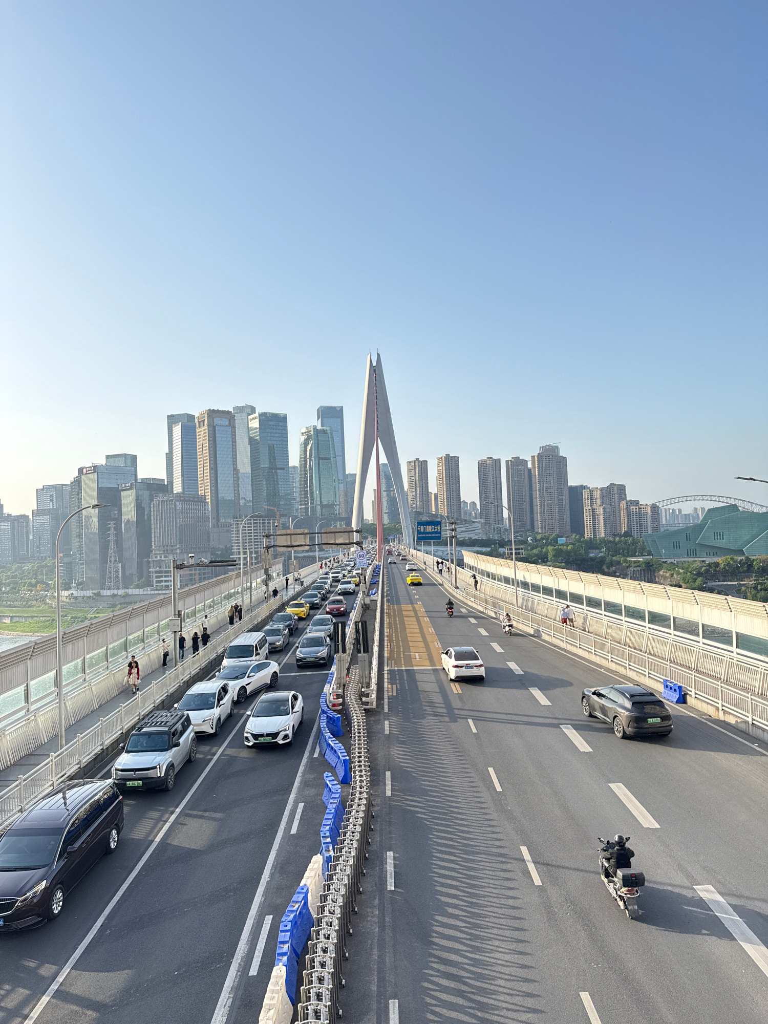 The image captures a vibrant urban scene from a bridge, looking along its length with a city skyline in the background. The perspective is from an elevated position, likely from a higher point on the…read more